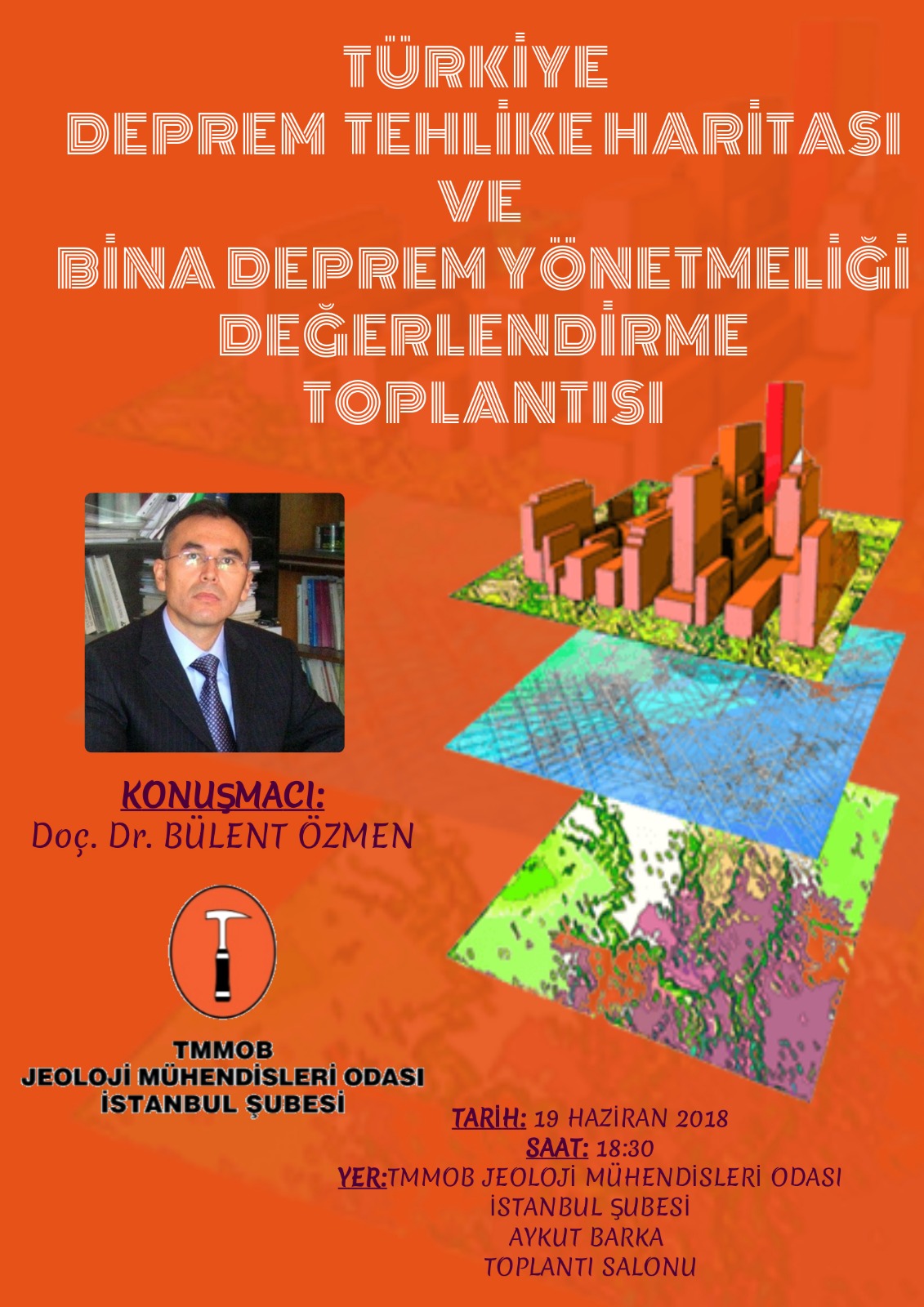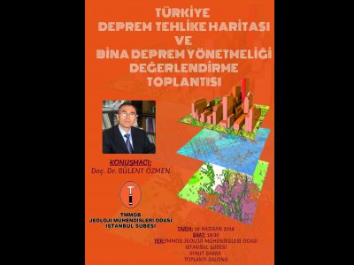 TMMOB Jeoloji Mühendisleri Odası İstanbul Şubesi’n de, Doç. Dr. Bülent ÖZMEN’in konuşmacı olarak katılacağı, ‘’Türkiye Deprem Tehlike Haritası ve Bina Deprem Yönetmeliği’’ konusunda bir değerlendirme toplantısı yapılacaktır.