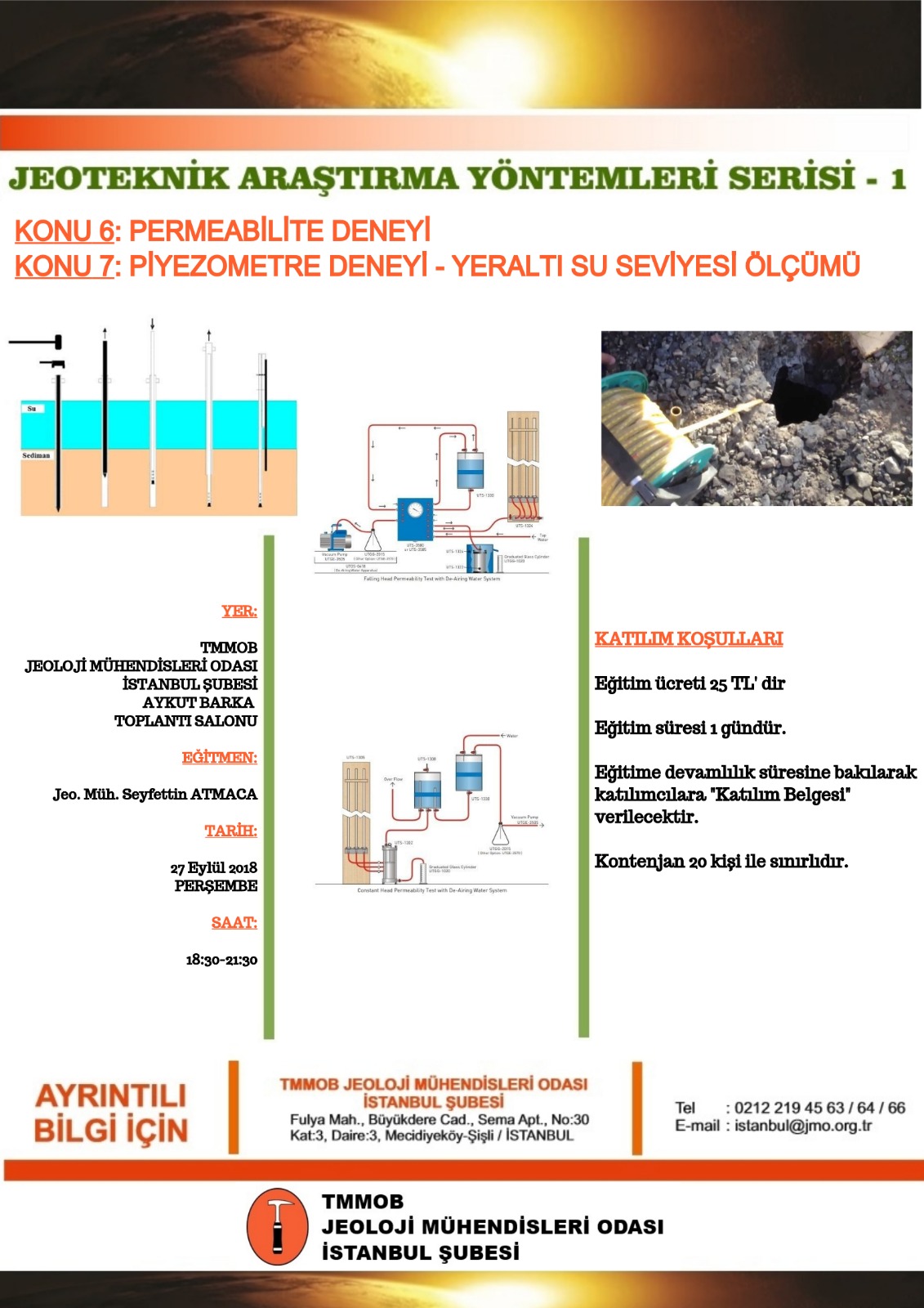 TMMOB Jeoloji Mühendisleri Odası İstanbul Şubesi Jeoteknik Komisyonu’nun 05.07.2018 tarihinde gerçekleştirdiği toplantı da alınan karar gereği, 2018 Aralık ayı sonuna kadar üyelerimize, iki haftada bir olmak üzere, aşağıda paylaştığımız on bir alt başlıkta, “Jeoteknik Araştırma Yöntemleri Serisi” ana konulu eğitim seminerleri düzenlenecektir.