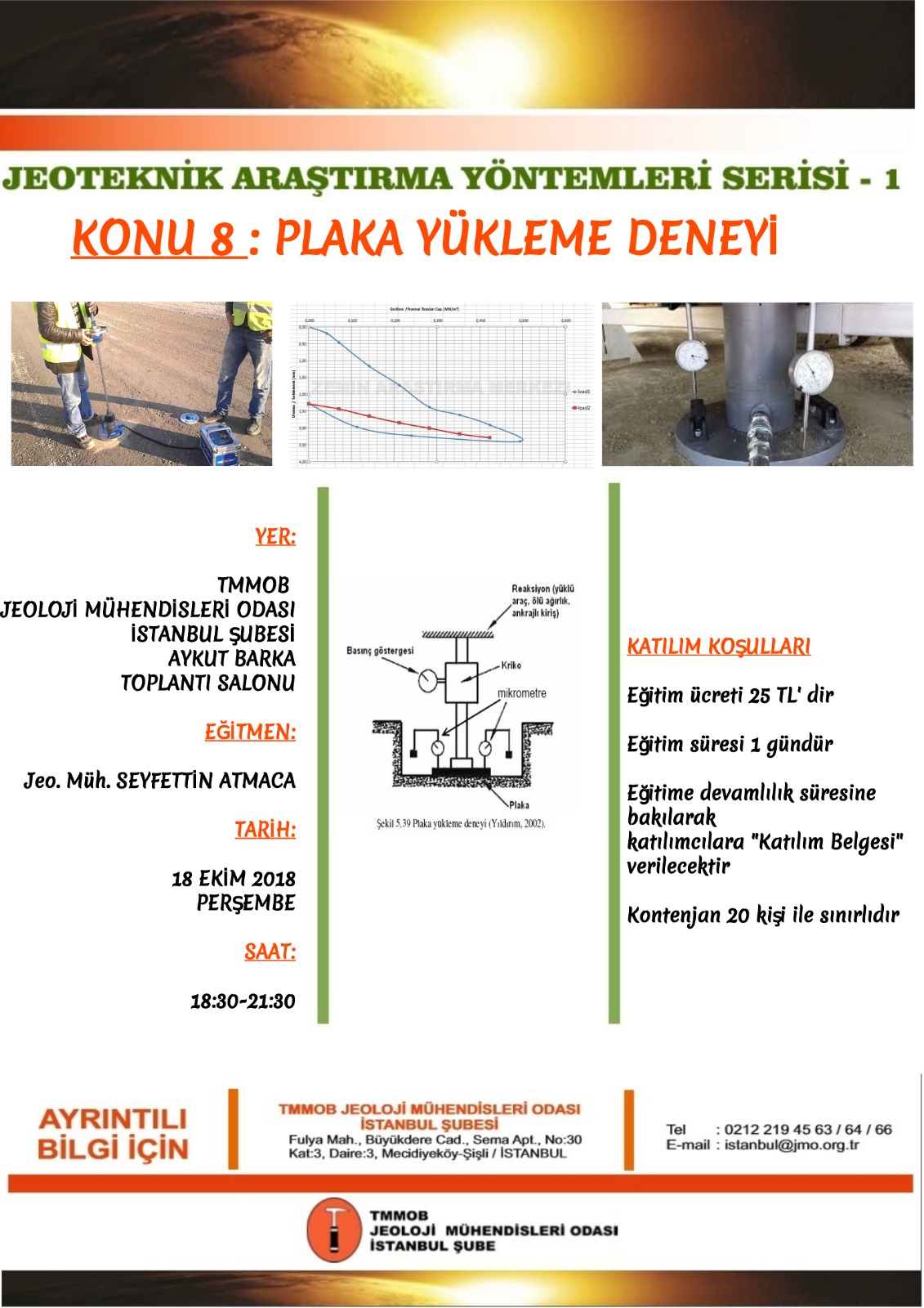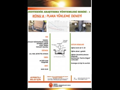 Sekizinci eğitim seminerimiz olan “PLAKA YÜKLEME DENEYİ EĞİTİM SEMİNERİ’’ Jeo. Müh. Seyfettin ATMACA tarafından gerçekleştirilecektir.