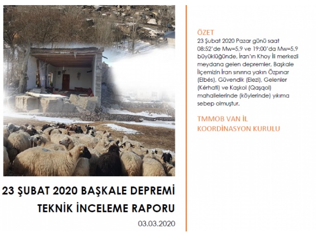 TMMOB Van İl Koordinasyon Kurulu, 23 Şubat 2020 tarihinde saat 08.52’de ve 19.00’da İran’ın Khoy İlinde meydana gelen depremleinr, Van`ın Başkale İlçesinin İran sınırına yakın köylerine etki etmesi üzerine teknik incelemelerde bulunarak 3 Mart 2020 tarihinde "23 Şubat 2020 Başkale Depremi Teknik İnceleme Rapor"unu kamuoyu ile paylaştı.