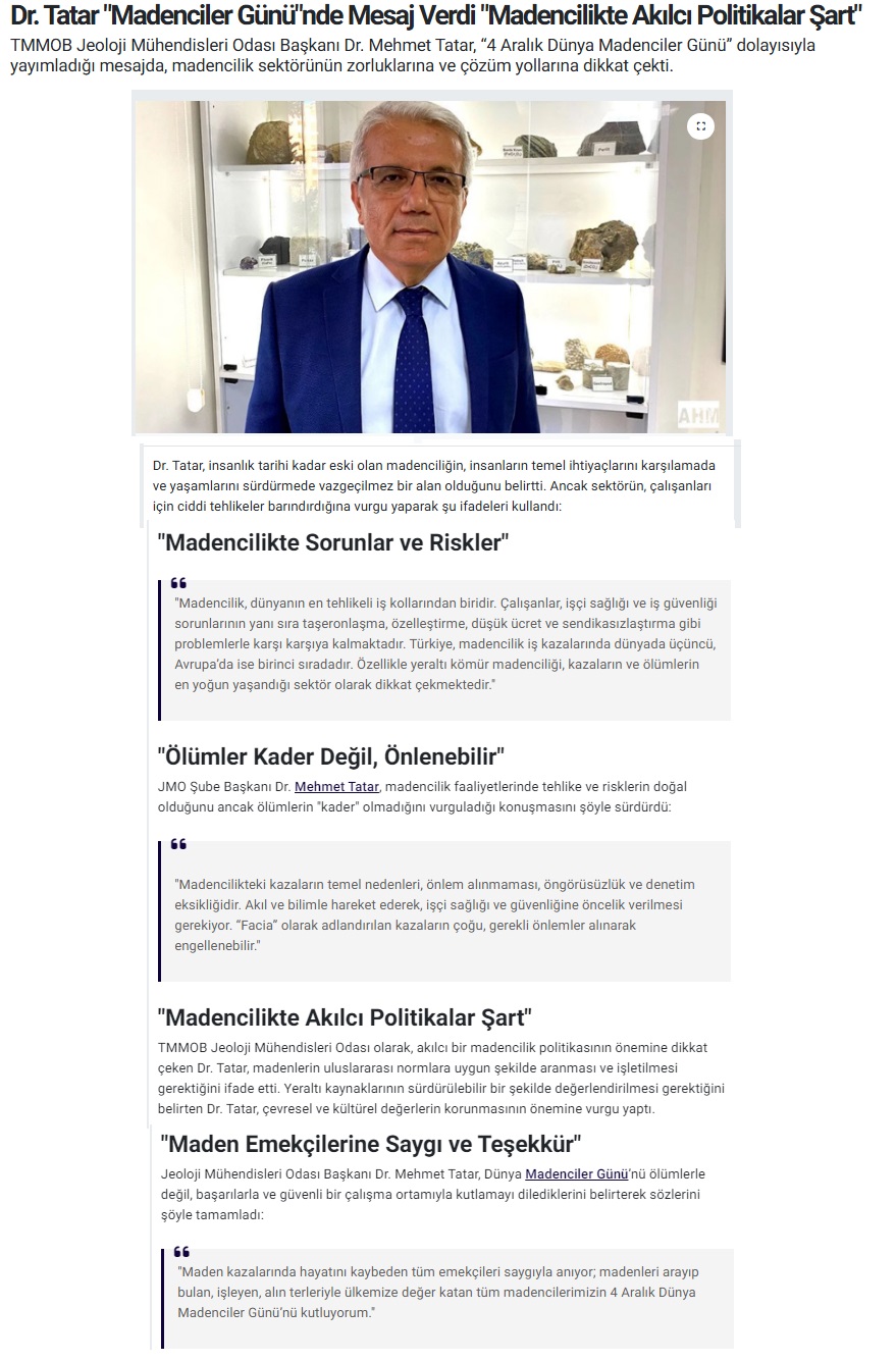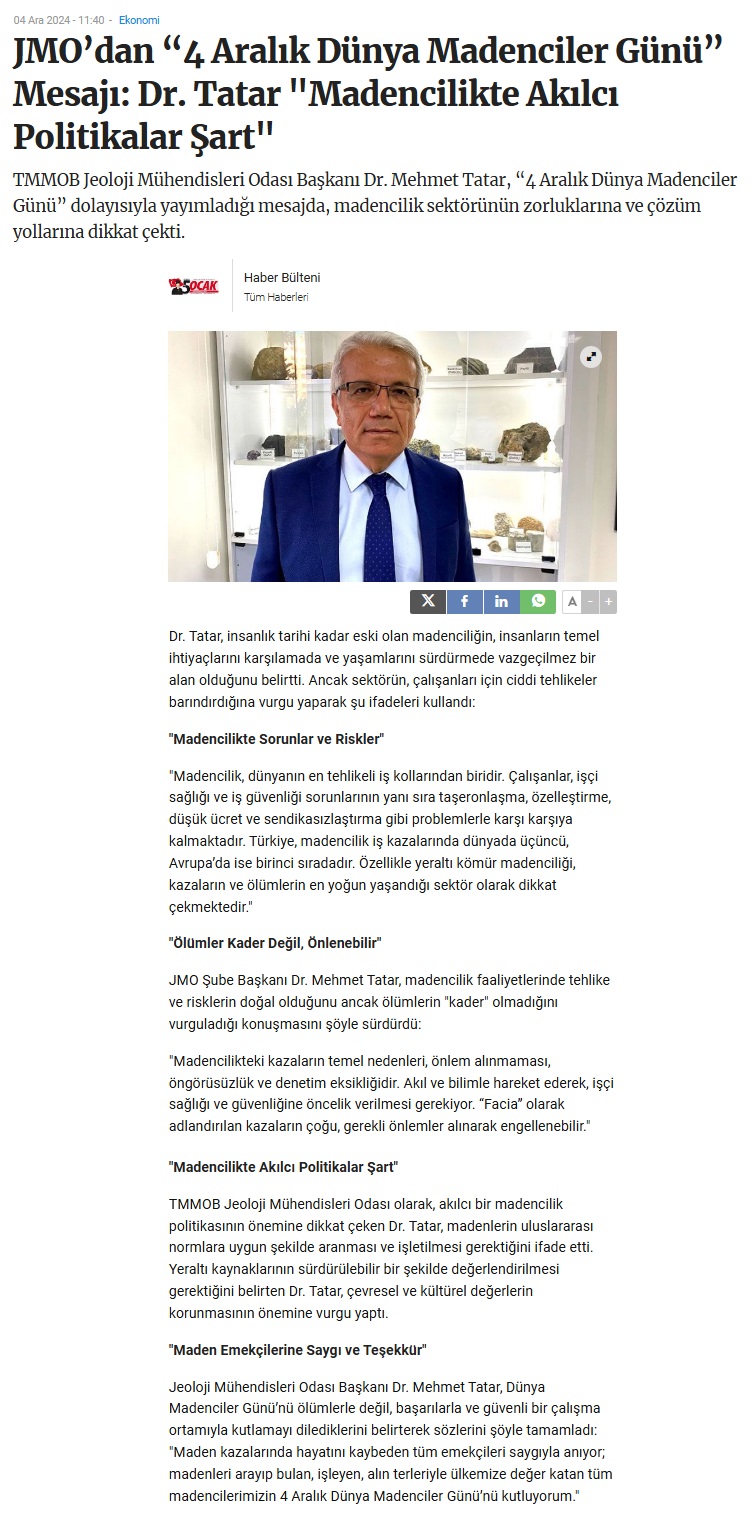 4 Aralık Dünya Madenciler Günü nedeni ile Şube Başkanımız Dr. Mehmet TATAR basın açıklaması yapmıştır.