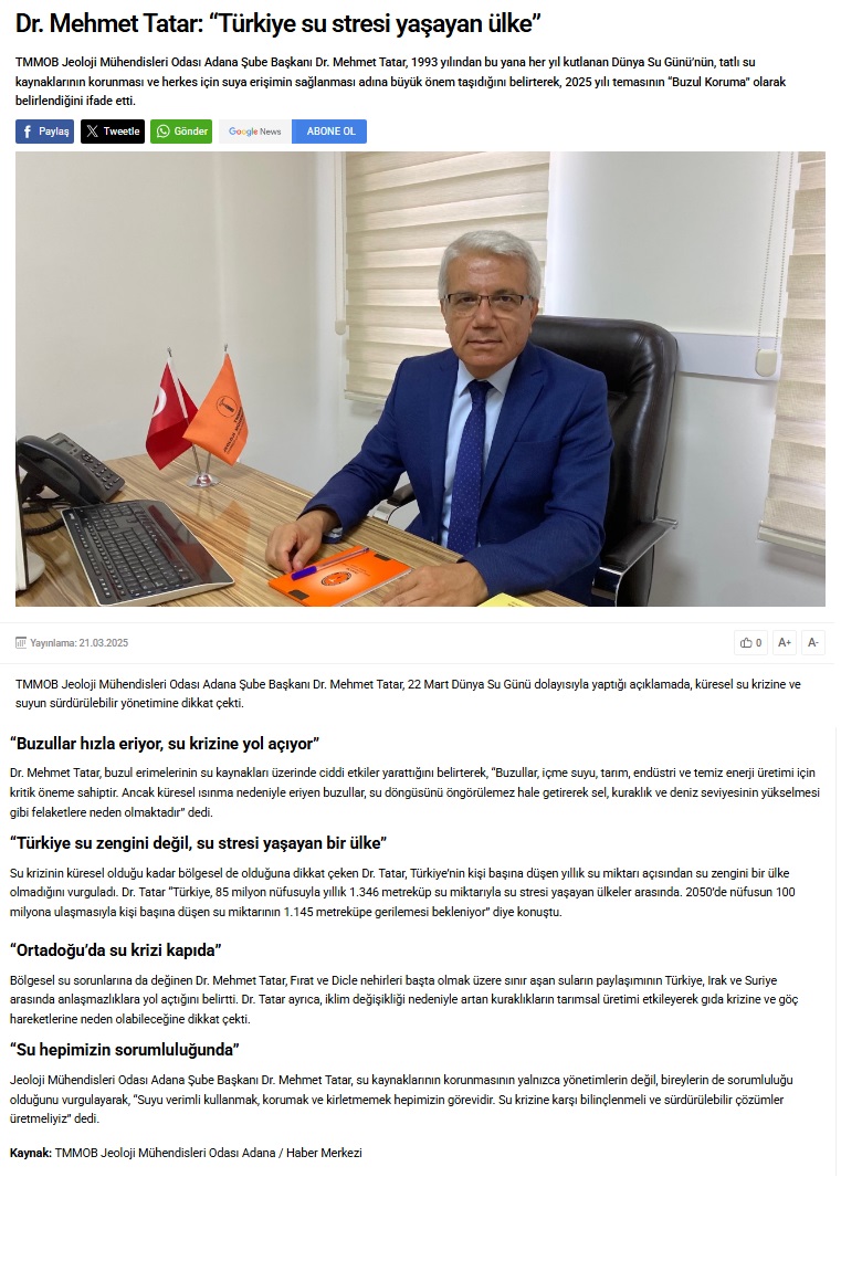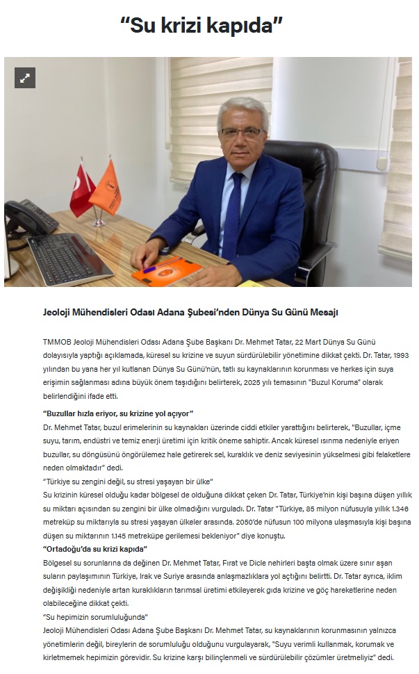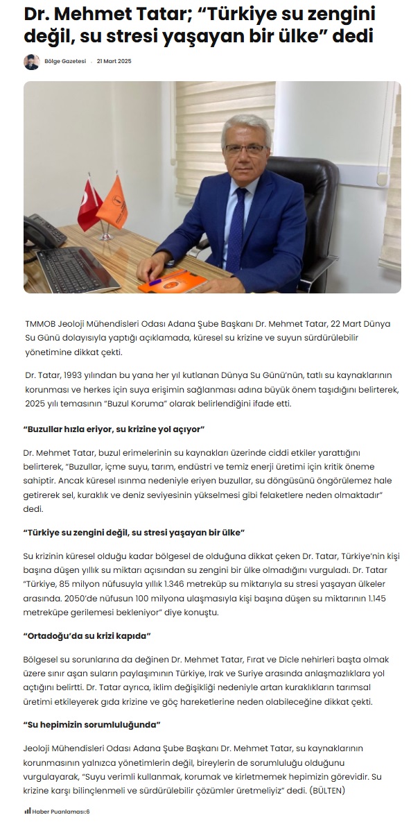 Dr. TATAR yaptığı basın açıklamasında; 1993`ten beri her yıl 22 Mart`ta kutlanan Dünya Su Günü`nün temel odak noktası, 2030 yılına kadar Sürdürülebilir Kalkınma Hedefi herkes için su ve sanitasyonun başarılmasını desteklemektir. 2025 Dünya Su Günü`nün temasının "Buzul Koruma" olduğunu belirterek, suyu verimli kullanmak, kullanırken kaynağında korumak ve kirletmemek yalnızca yönetimlerin ve yöneticilerin değil, her birimizin asli sorumluluğunda olduğu unutmamalıdır diyerek basın açıklamasına son vermiştir.