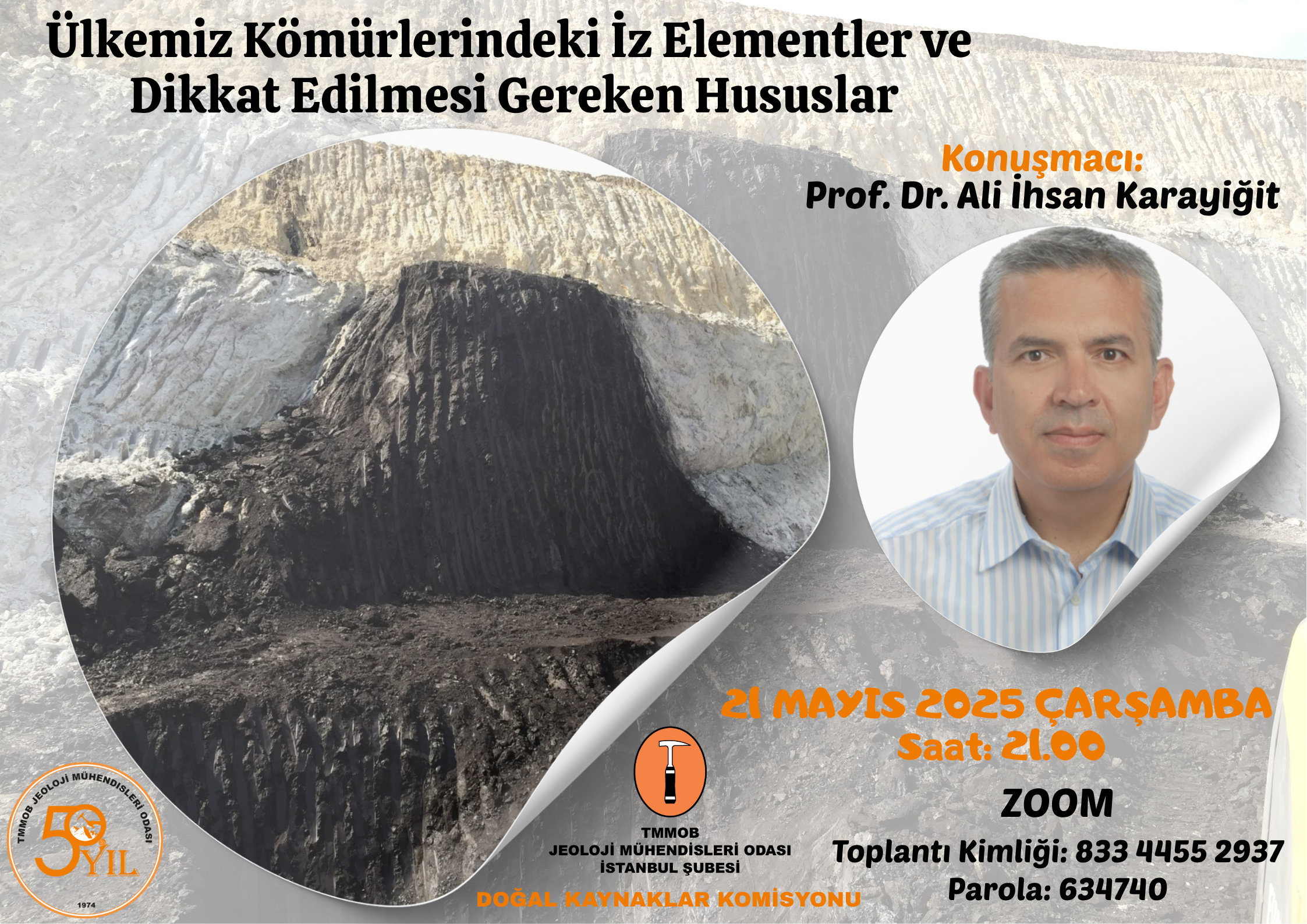TMMOB Jeoloji Mühendisleri Odası İstanbul Şubesi Doğal Kaynaklar Komisyonu tarafından ‘’ÜLKEMİZ KÖMÜRLERİNDEKİ İZ ELEMENTLER VE DİKKAT EDİLMESİ GEREKEN HUSUSLAR’’ konulu online bir söyleşi gerçekleştirilecektir.