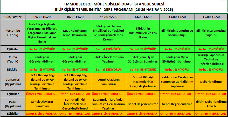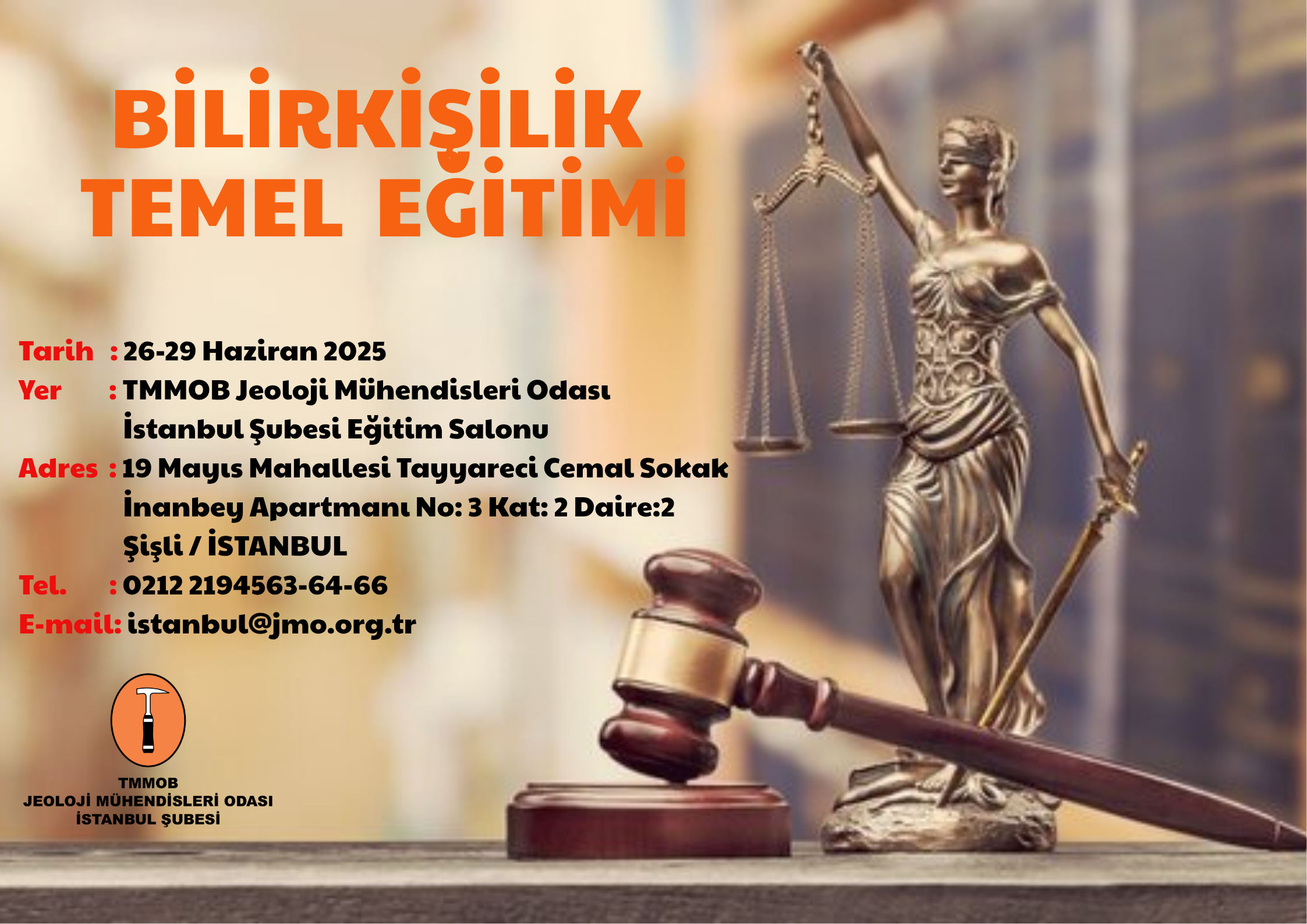 Bilirkişilik Temel Eğitimi İstanbul’da, 26-29 Haziran 2025 tarihleri arasında, TMMOB Jeoloji Mühendisleri Odası İstanbul Şubesi Eğitim Salonu`nda gerçekleştirilecektir.