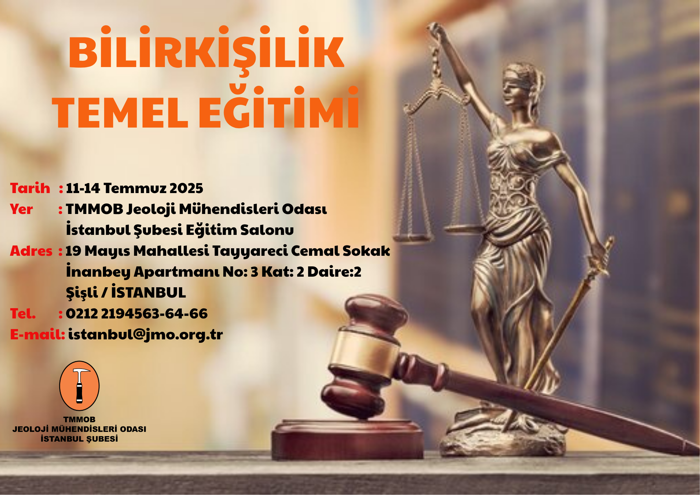 Bilirkişilik Temel Eğitimi İstanbul’da, 11-14 Temmuz 2025 tarihleri arasında, TMMOB Jeoloji Mühendisleri Odası İstanbul Şubesi Eğitim Salonu`nda gerçekleştirilecektir.