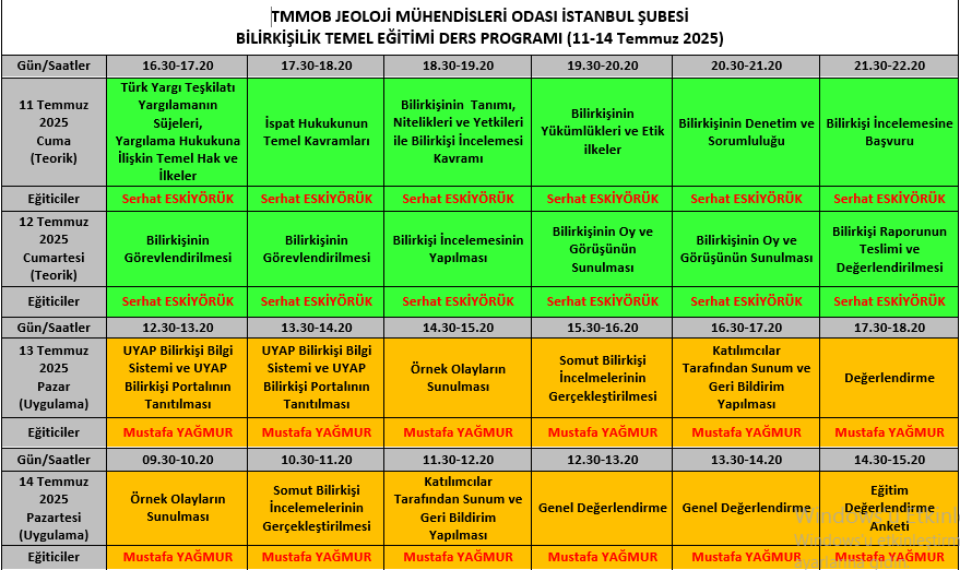Buna göre Bilirkişilik Temel Eğitimi İstanbul’da, 11-14 Temmuz 2025 tarihleri arasında, TMMOB Jeoloji Mühendisleri Odası İstanbul Şubesi Eğitim Salonu`nda gerçekleştirilecektir.