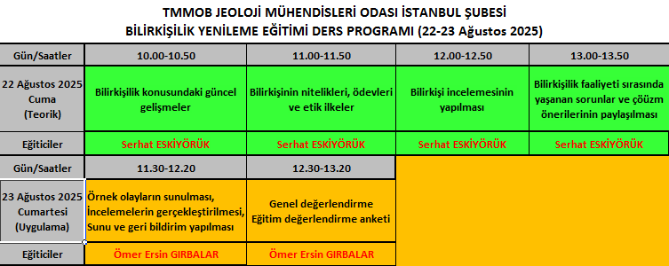 Bilirkişilik Yenileme Eğitimi İstanbul’da, 22-23 Ağustos 2025 (Cuma-Cumartesi) tarihlerinde, TMMOB Jeoloji Mühendisleri Odası İstanbul Şubesi Eğitim Salonu`nda gerçekleştirilecektir.