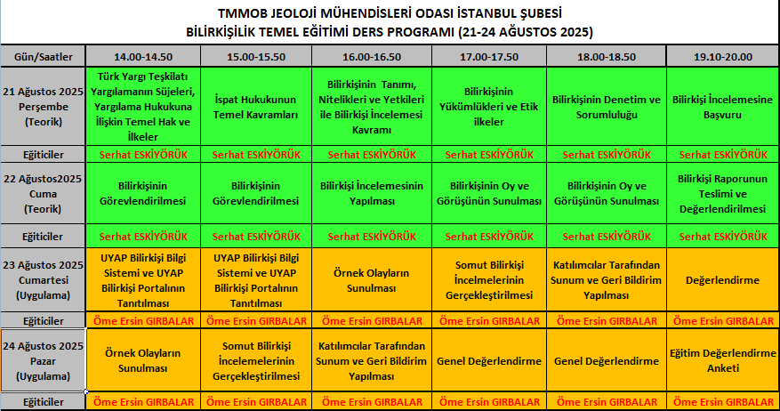 Bilirkişilik Temel Eğitimi İstanbul’da, 21-24 Ağustos 2025 tarihleri arasında, TMMOB Jeoloji Mühendisleri Odası İstanbul Şubesi Eğitim Salonu`nda gerçekleştirilecektir.