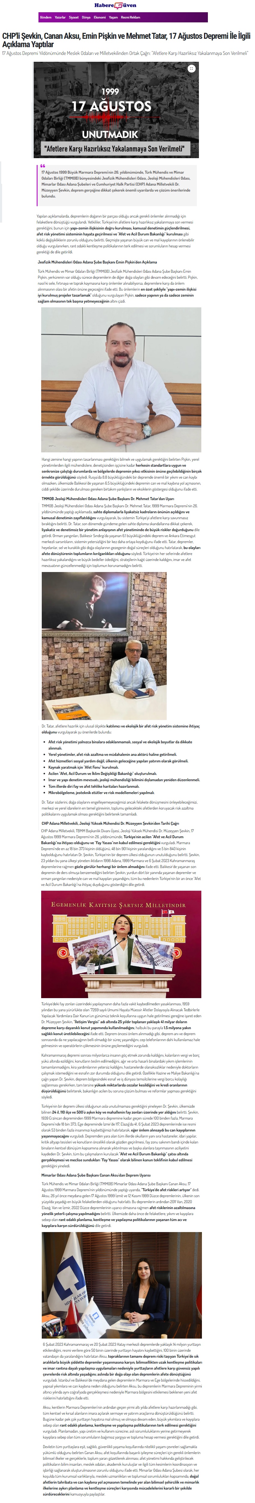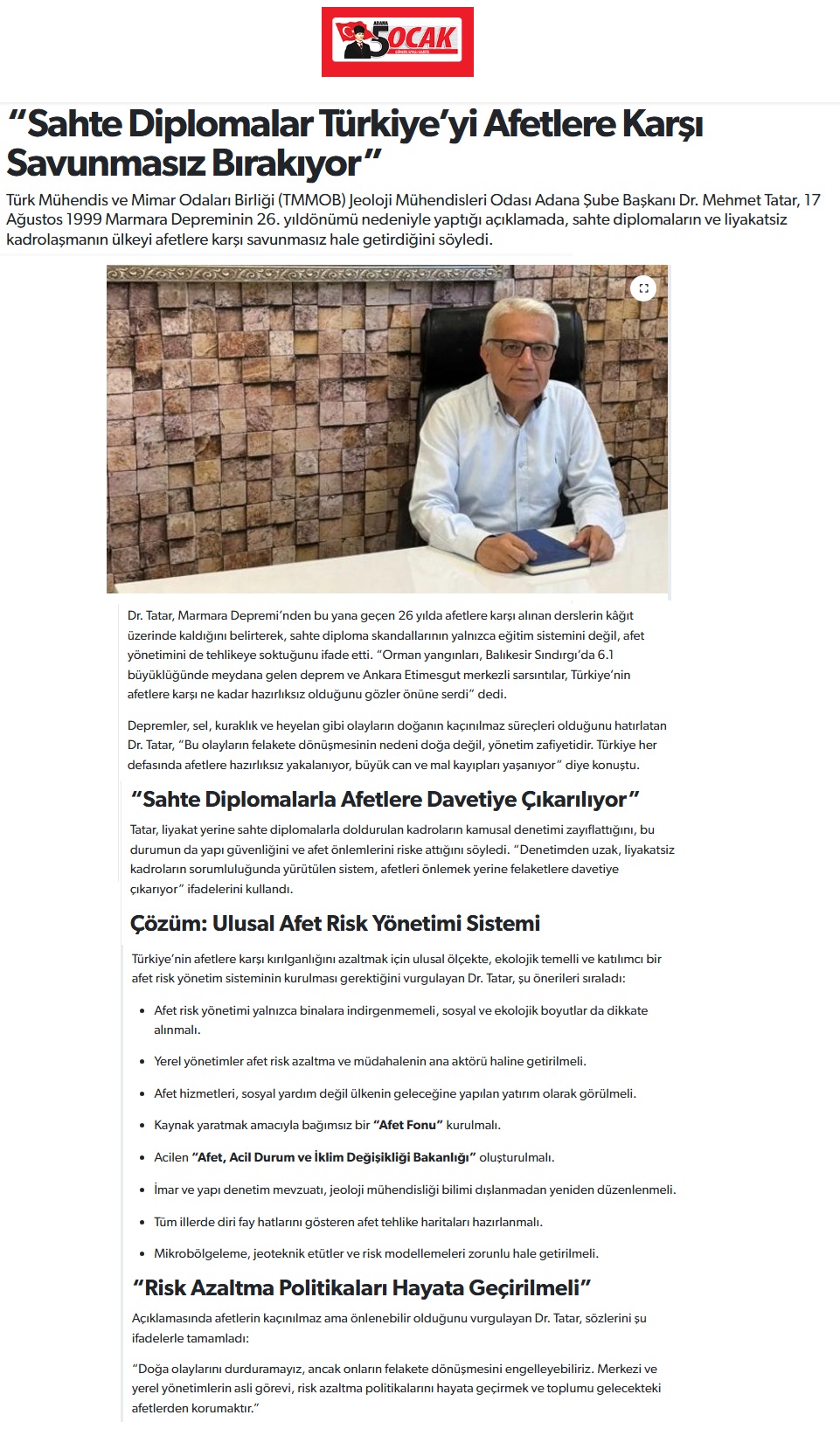 17.08.1999 tarihinde meydana gelen Gölcük Depremi üzerinden geçen 26 yılın ardından, Türkiye`nin afetlere karşı eksikliklerinin devam ettiğini dile getiren Şube Başkanımız Dr. TATAR;