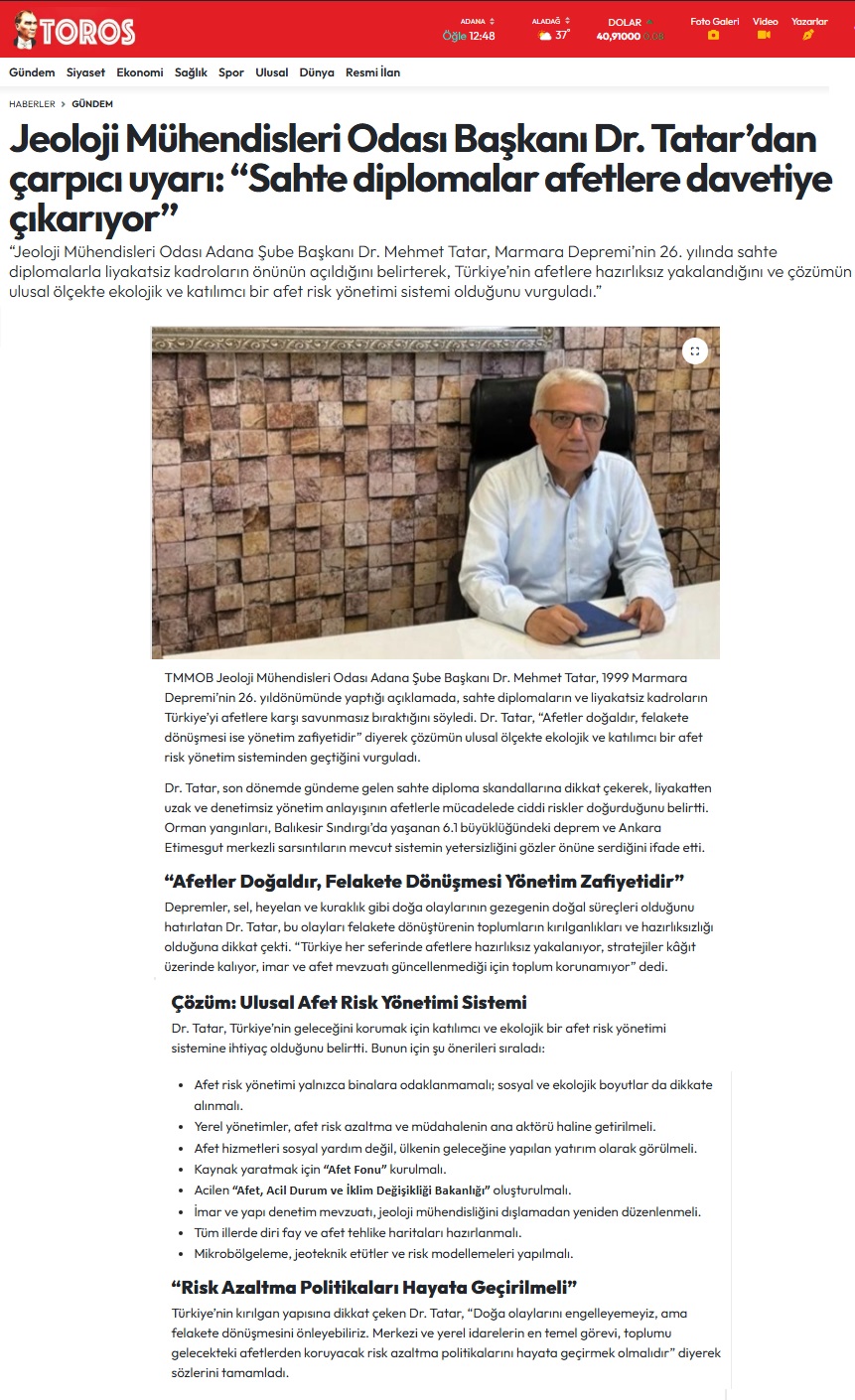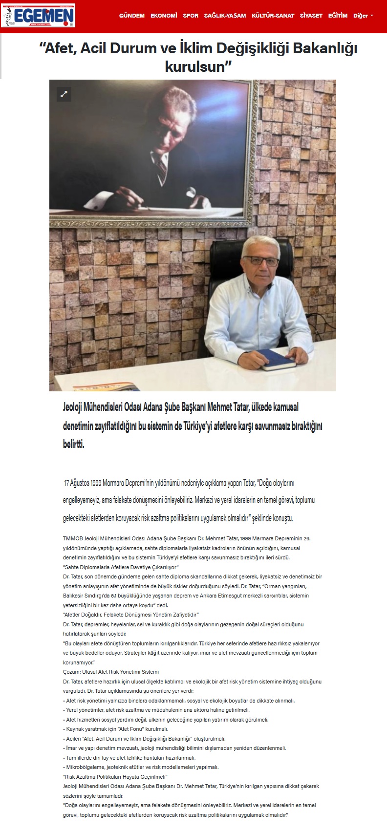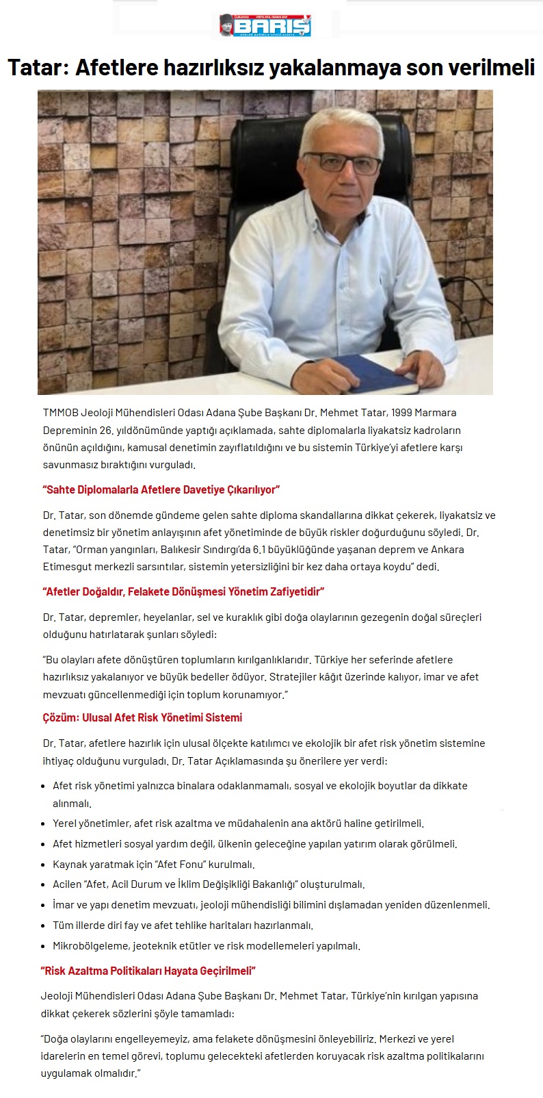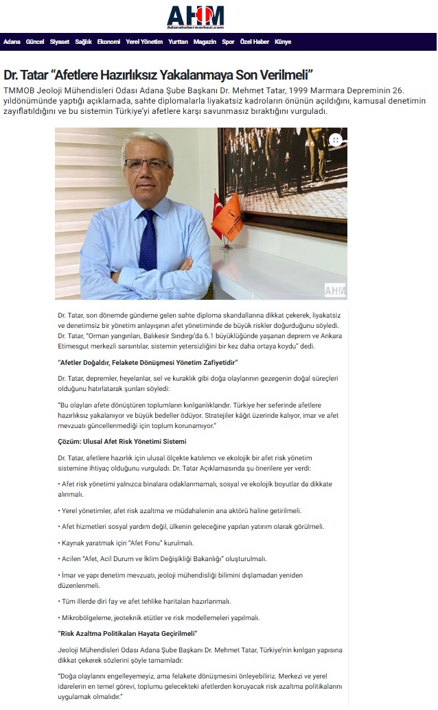 • Mikrobölgeleme, jeoteknik etütler ve risk modellemeleri yapılmalı önerilerine değinerek basın açıklamasına son vermiştir,
