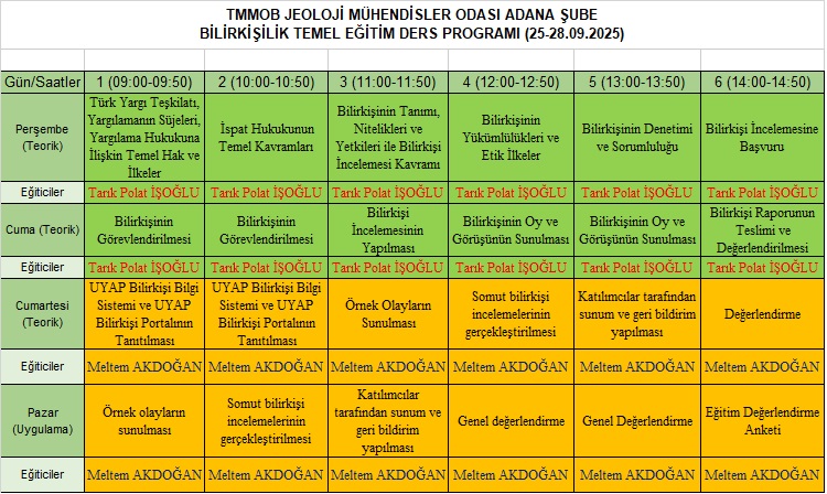 Buna göre Bilirkişilik Temel Eğitimi, 25 - 28 Eylül 2025 tarihleri arasında, TMMOB Jeoloji Mühendisleri Odası Adana Şubesi Eğitim Salonu`nda gerçekleştirilecektir.