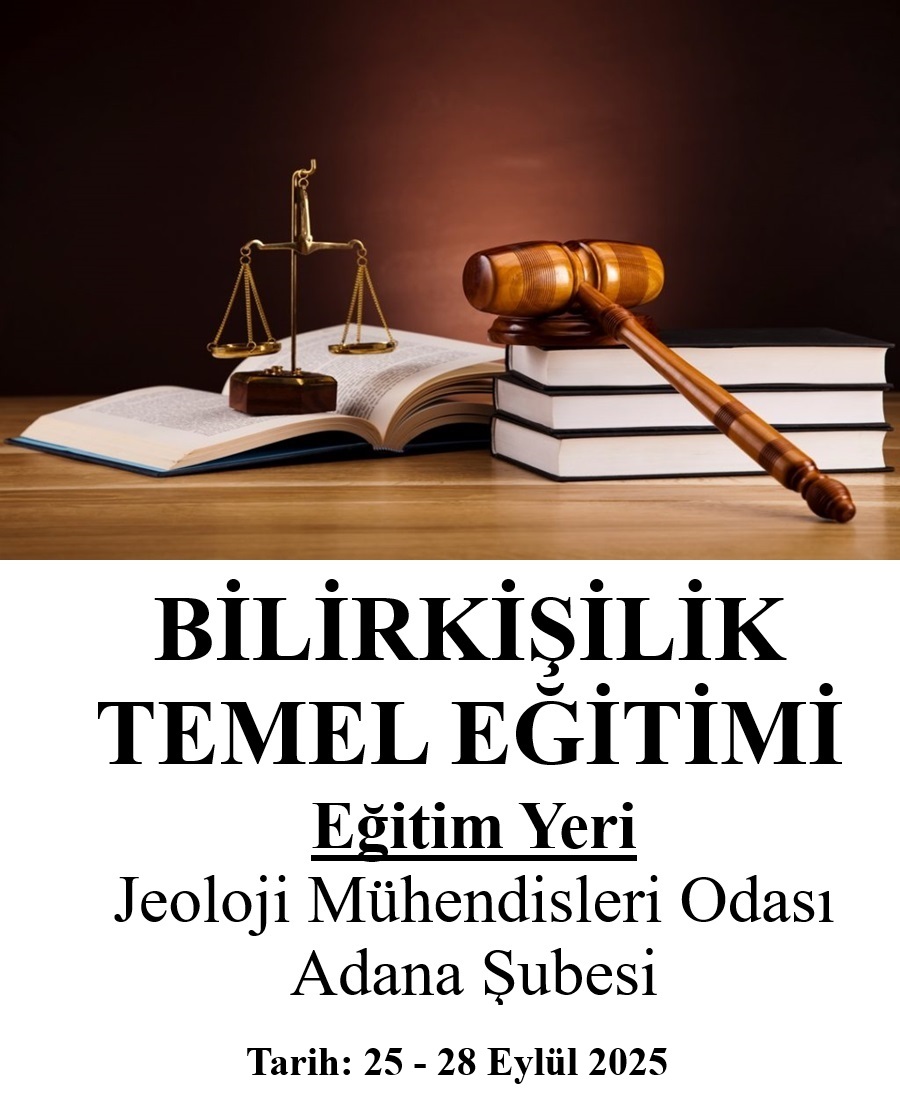 Bilirkişilik Temel Eğitimi, 25 - 28 Eylül 2025 tarihleri arasında, TMMOB Jeoloji Mühendisleri Odası Adana Şubesi Eğitim Salonu`nda gerçekleştirilecektir.