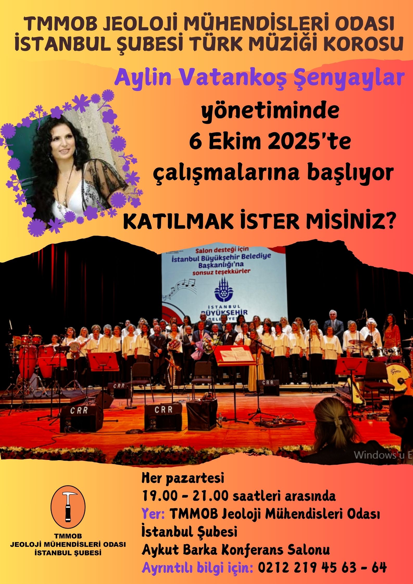 TMMOB Jeoloji Mühendisleri Odası İstanbul Şubesi Türk Müziği Koromuz yeni dönem çalışmalarına 6 Ekim 2025 Pazartesi günü başlıyor. Değerli Aylin VATANKOŞ ŞENYAYLAR yönetiminde başlayacak olan yeni dönemimizin sağlıkla, mutlulukla, müzikle, konserle dolu geçmesini diliyoruz.