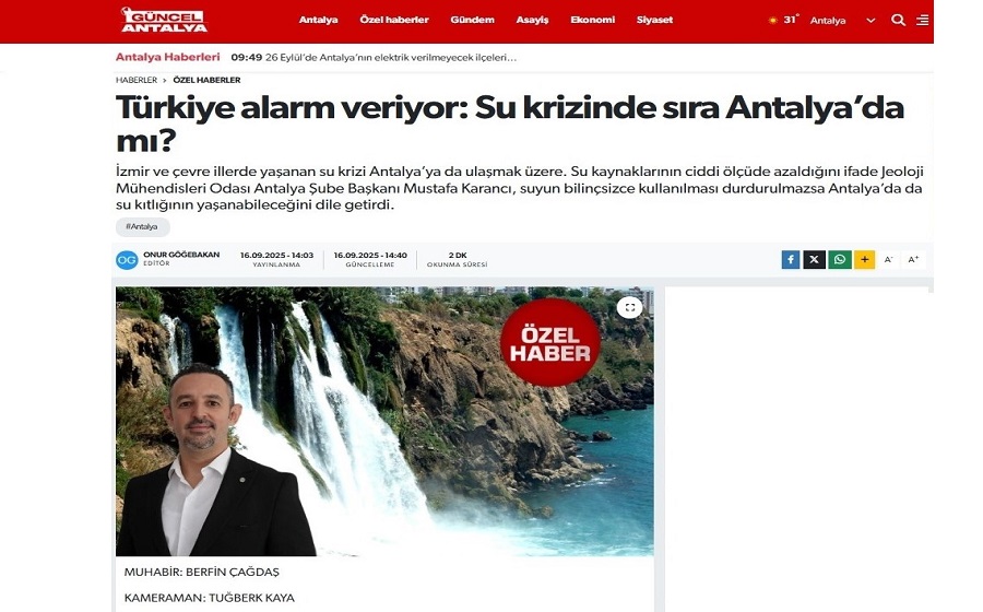 Şube Başkanımız Mustafa Karancı 16 Eylül 2025 tarihinde Güncel Antalya`ya "Antalya Su Potansiyeli ve Önlemlerin Alınması " hakkında röportaj verdi.
