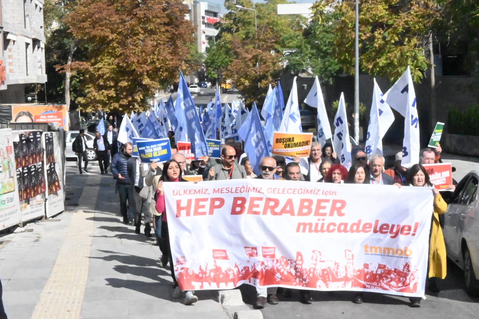 Ülkemizdeki ekonomik, toplumsal ve siyasal krizlerin meslektaşlarımıza ve meslek alanlarımıza etkilerinin ve bu bağlamda yaşanan sorunları gündeme getirmek amacıyla 18 Ekim 2025 tarihinde Ankara`da bir araya gelen Mühendis, Mimar ve Şehir Plancıları; MMO Eğitim ve Kültür Merkezi`nden Madenci Anıtı`na yürüyerek burada bir basın açıklaması gerçekleştirdiler.