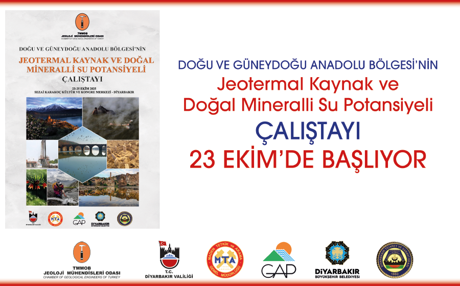 TMMOB Jeoloji Mühendisleri Odasının öncülüğünde Diyarbakır Valiliği, Maden Tetkik ve Arama Genel Müdürlüğü (MTA), GAP İdaresi, Diyarbakır Büyükşehir Belediyesi ile Diyarbakır Ticaret Odası ortaklığı ile 23-25 Ekim 2025 tarihleri arasında “Doğu ve Güneydoğu Anadolu Bölgesi’nin Jeotermal Kaynak ve Doğal Mineralli Su Potansiyeli Çalıştayı” düzenlenecektir.  Güneydoğu Anadolu Belediyeler Birliği, TMMOB Diyarbakır İl Koordinasyon Kurulu ile çok sayıda özel sektör kuruluşu tarafından desteklenen Çalıştay; Diyarbakır’da, “Sezai Karakoç Kültür ve Kongre Merkezinde” düzenlenecek olup, bilim insanları, akademisyenler, ilgili kamu kurum ve kuruluşları, meslek örgütleri ile sivil toplum kuruluşları temsilcileri, yerel yönetimler, kent ve çevre kuruluşları ve duyarlı toplum kesimleri yer alacaktır.