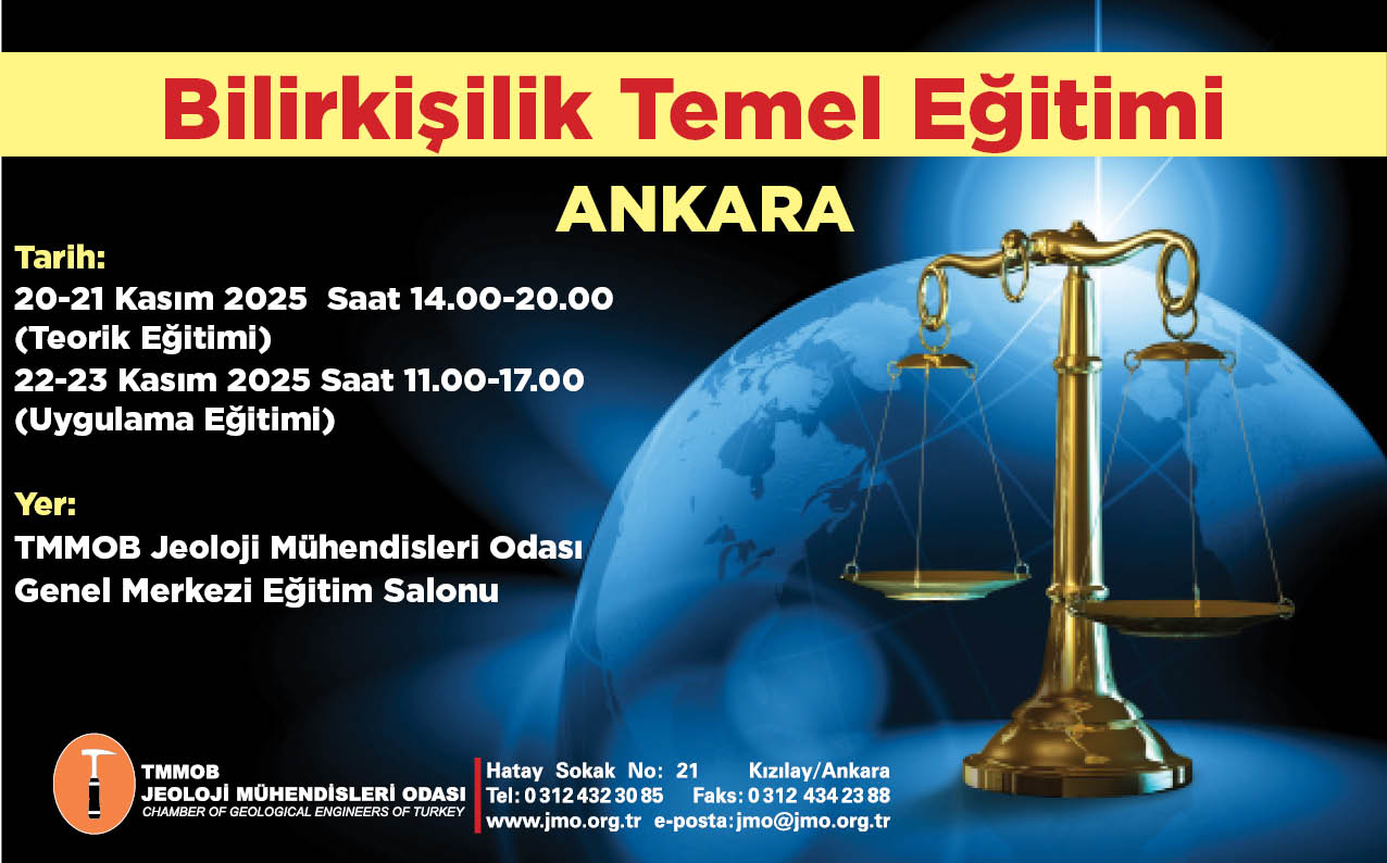 Bilirkişilik Temel Eğitimi Ankara`da TMMOB Jeoloji Mühendisleri Odası Genel Merkez Binamızda 20-21 Kasım 2025 Saat 14.00-20.00`da Teorik Eğitimi , 22-23 Kasım 2025 Saat 11.00-17.00`da Uygulama Eğitimi Kocatepe Mahallesi Hatay Sokak No:21 Eğitim Salonu`nda düzenlenmesi planlanmaktadır.