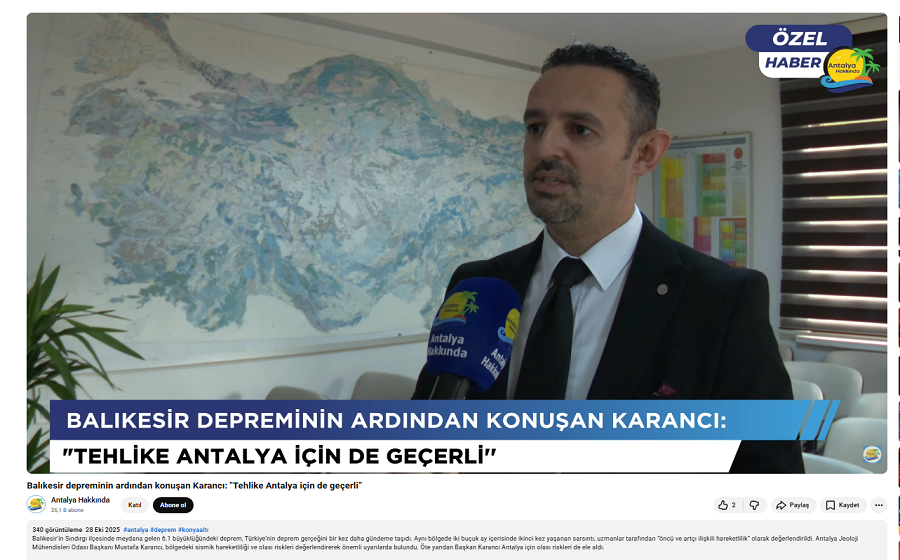 Şube Başkanımız Mustafa Karancı 28 Ekim 2025 tarihinde Antalya Hakkında`ya , Balıkesir’in Sındırgı ilçesinde meydana gelen 6.1 büyüklüğündeki deprem sonrası bölgedeki sismik hareketliliği ve olası riskleri değerlendirerek, Antalya için olası riskleri ele aldı ve önemli uyarılarda bulundu.