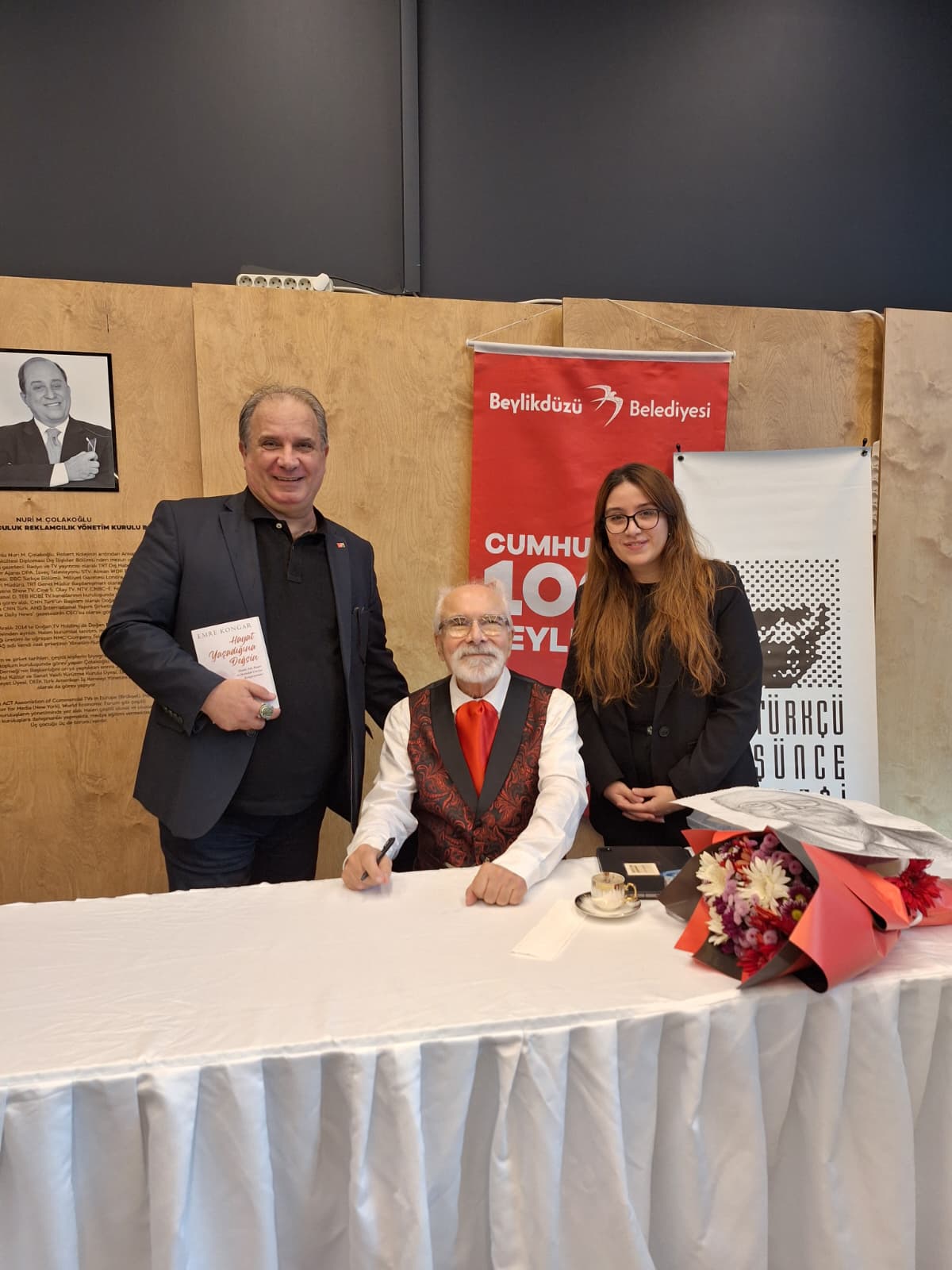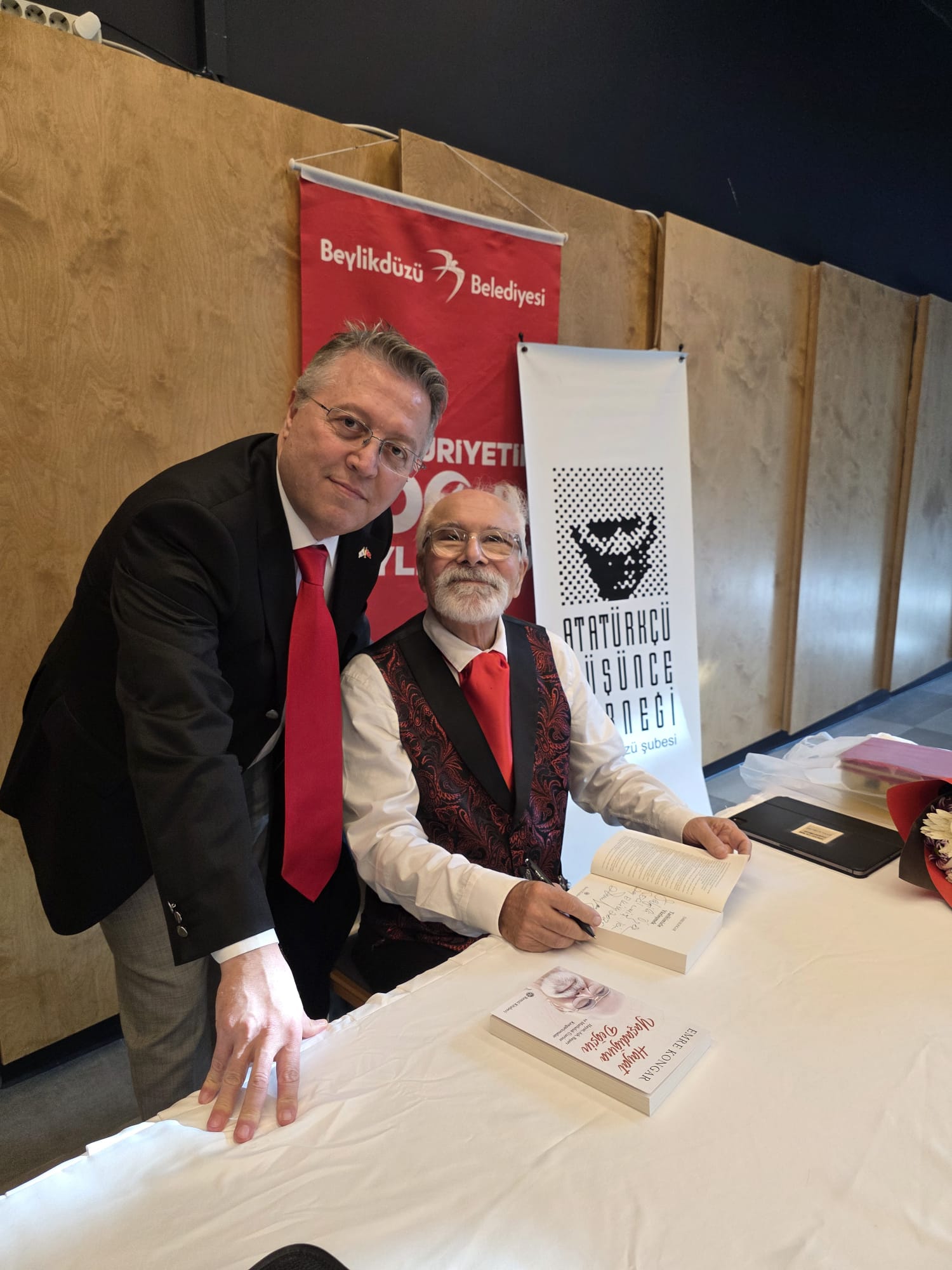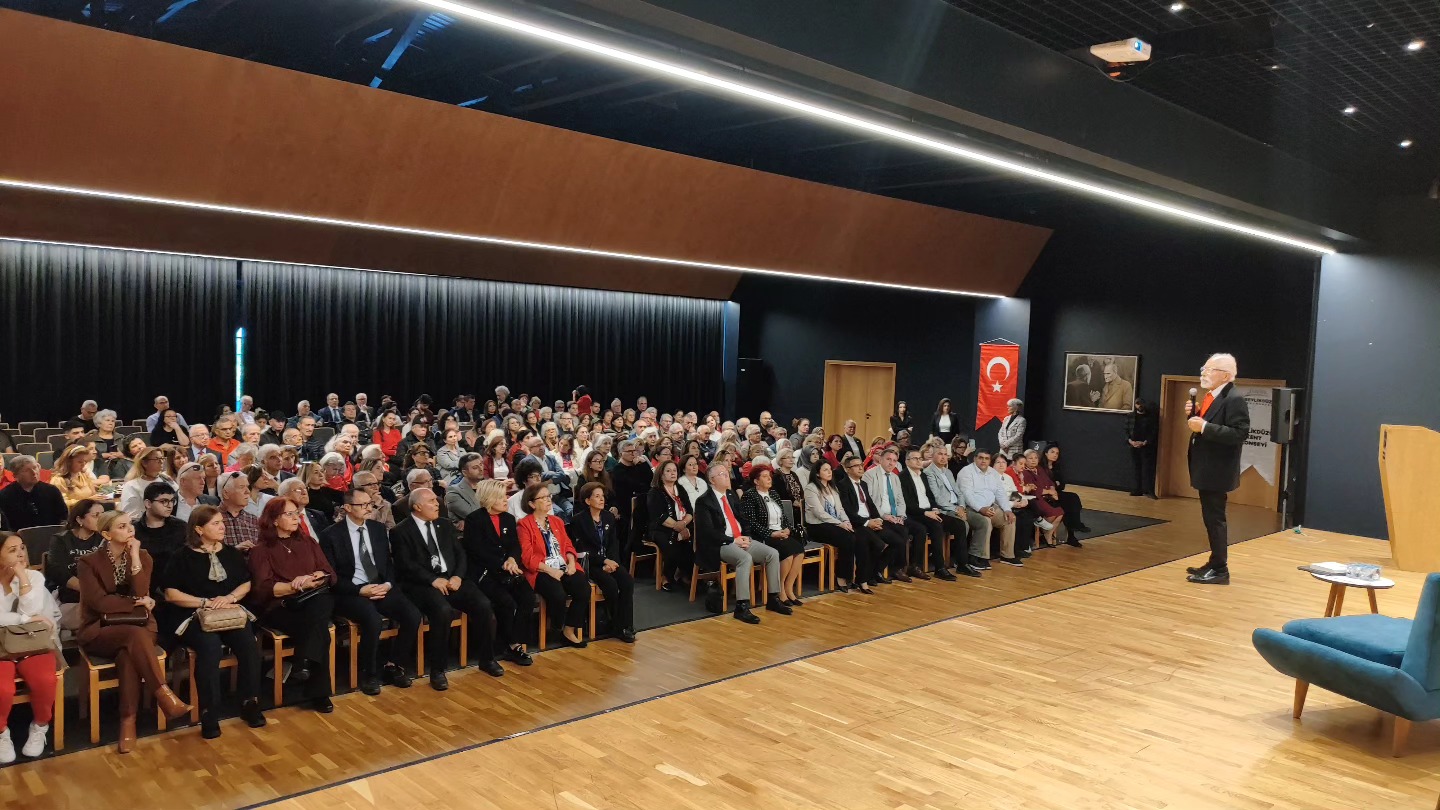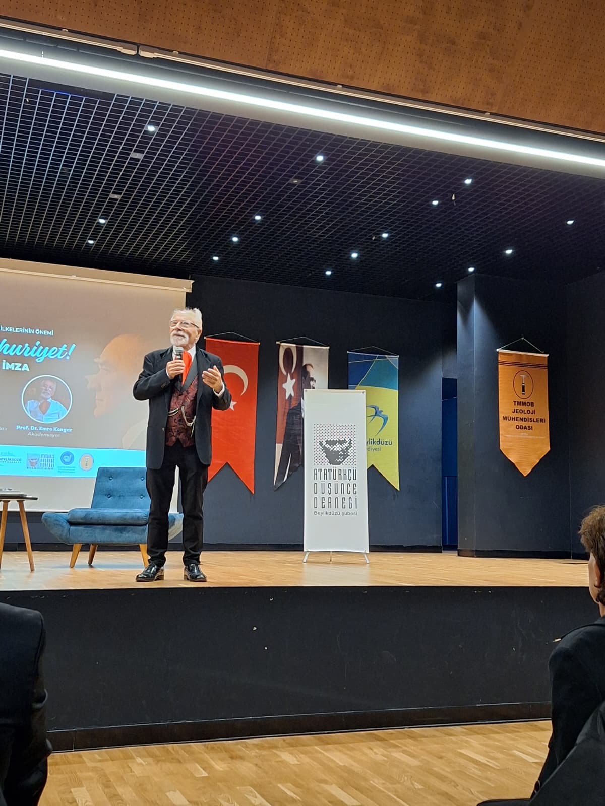 Konferansa konuşmacı olarak katılan Prof. Dr. Emre Kongar, Atatürk ilke ve devrimlerinin çağdaş dünyadaki önemine ilişkin değerlendirmelerini paylaşmış, etkinlik sonunda katılımcılar için kitaplarını imzalamıştır.