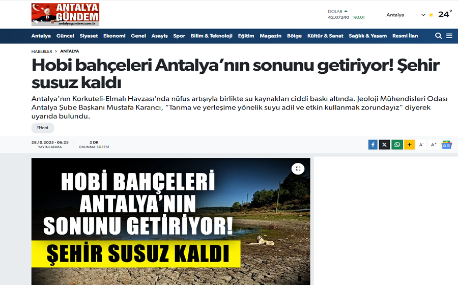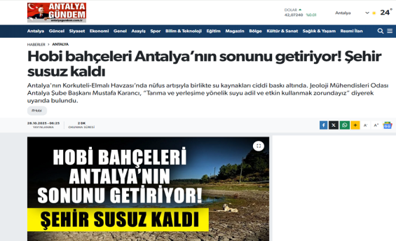 Şube Başkanımız Mustafa Karancı 28 Ekim 2025 tarihinde Antalya Gündem Gazetesi`ne "Korkuteli-Elmalı Havzası Su Potansiyeli ve Önlemlerin Alınması " hakkında röportaj verdi.