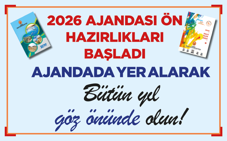 TMMOB Jeoloji Mühendisleri Odası 2026 yılı Ajandası ön hazırlıkları başladı.  TMMOB Jeoloji Mühendisleri Odası olarak her yıl 10.000 adet ajanda basıp üyelerimiz başta olmak üzere MTA Genel Müdürlüğü, DSİ, Karayolları Genel Müdürlüğü, İller Bankası, Çevre, Şehircilik ve İklim Değişikliği Bakanlığı ve Bağlı Genel Müdürlükleri, Enerji ve Tabii Kaynaklar Bakanlığı ve Bağlı Genel Müdürlükleri, Kültür ve Turizm Bakanlığı ve Bağlı Genel Müdürlükleri, Ulaştırma Bakanlığı ve Bağlı Genel Müdürlükleri, Belediyeler, İl Özel İdareleri ile sektördeki kamu ve özel kurumlara dağıtılacak olan ajandamızın 2026 yılı baskısı hazırlanmaktadır.
