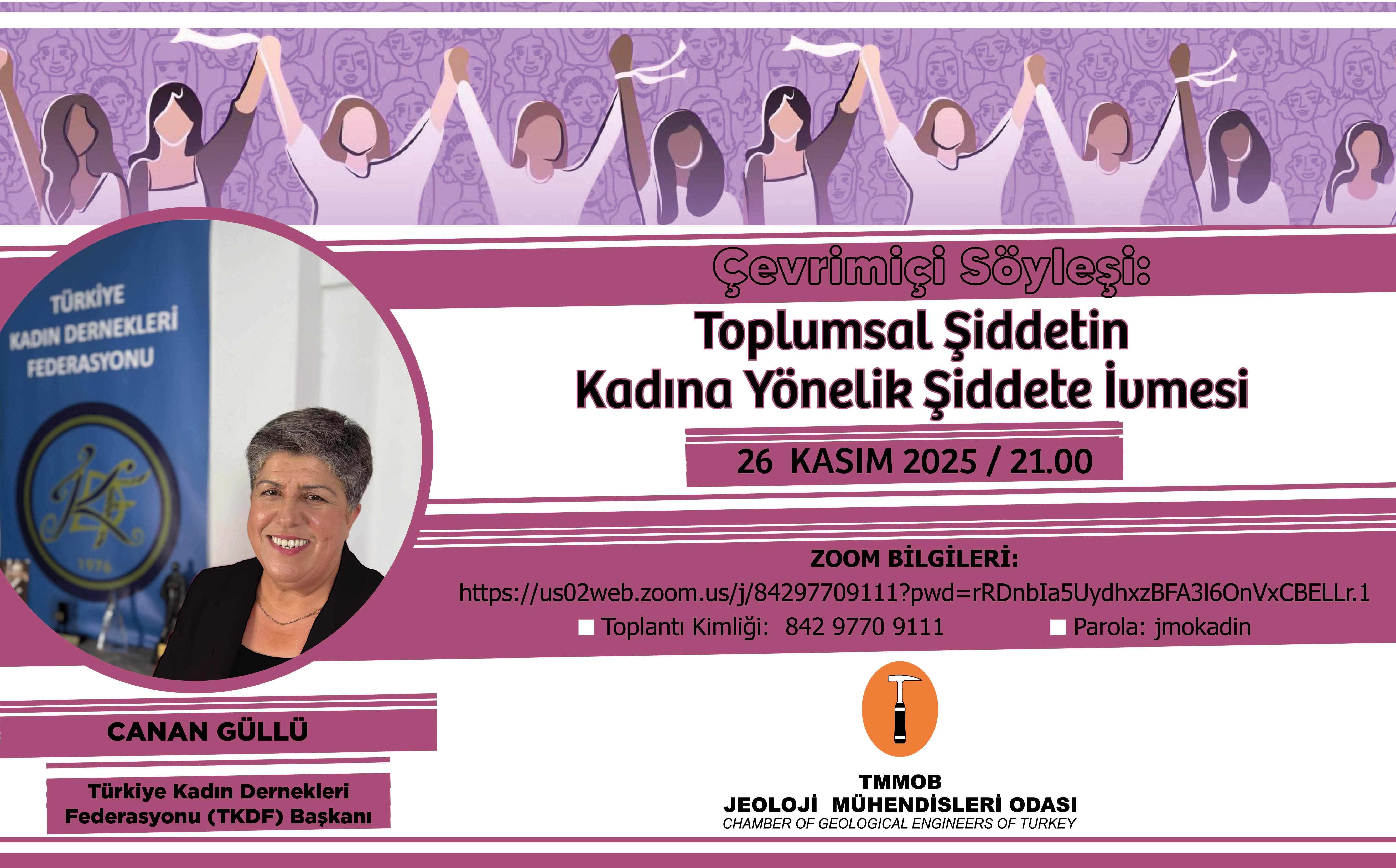 Türkiye Kadın Dernekleri Federasyonu (TKDF) Başkanı Sayın Canan Güllü tarafından yapılacak çevrimiçi söyleşi 26 Kasım 2025 Çarşamba günü saat 21.00’da gerçekleştirilecektir.
