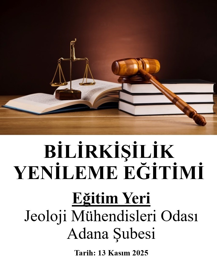 Bilirkişilik Yenileme Eğitimi, 13 Kasım 2025 tarihinde, TMMOB Jeoloji Mühendisleri Odası Adana Şubesi Eğitim Salonu`nda gerçekleştirilecektir.