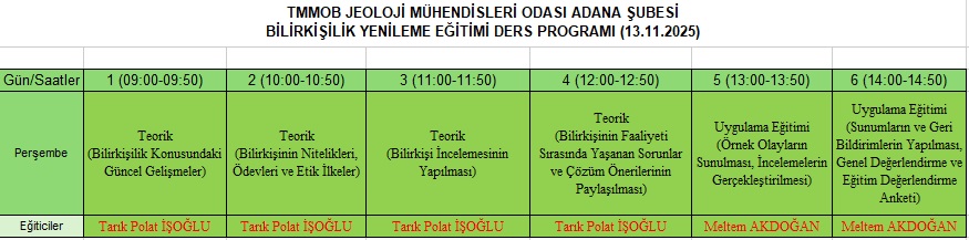 Buna göre Bilirkişilik Yenileme Eğitimi, 13 Kasım 2025 tarihinde, TMMOB Jeoloji Mühendisleri Odası Adana Şubesi Eğitim Salonu`nda gerçekleştirilecektir.