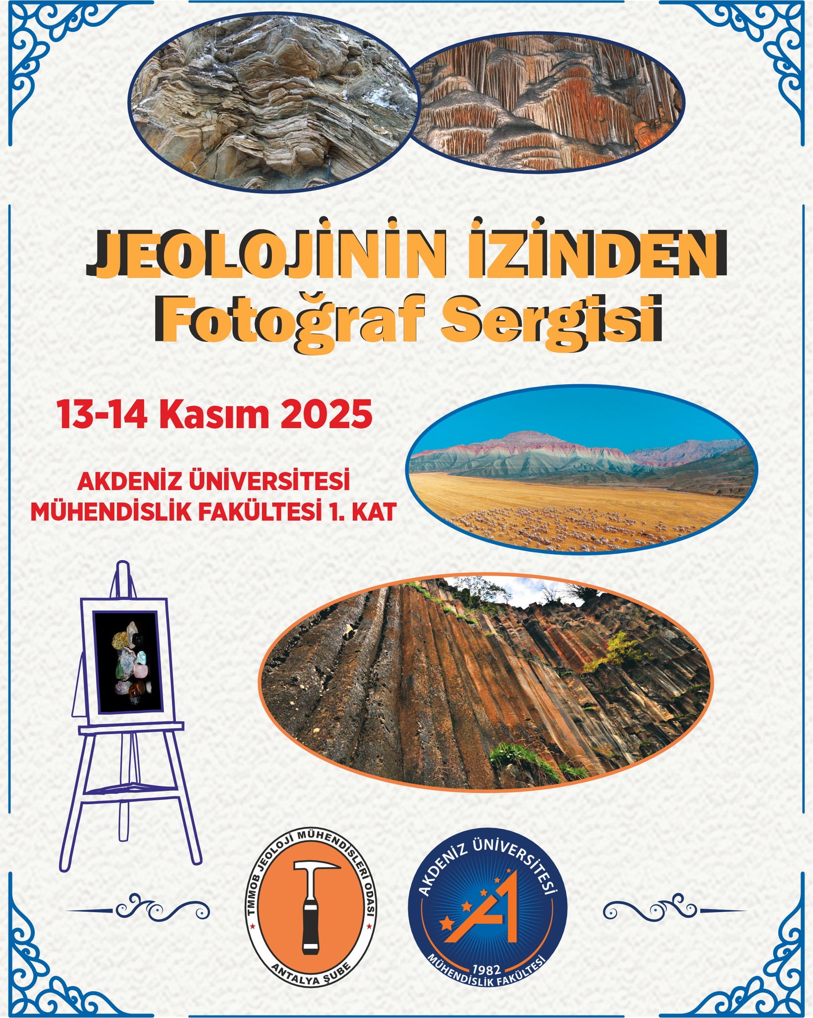 "Jeolojinin İzinden" temalı Fotoğraf Sergisi, 13-14 Kasım 2025 tarihlerinde Akdeniz Üniversitesi Jeoloji Mühendisliği Bölümü iş birliği ile Mühendislik Fakültesinde gerçekleştirilmiştir. Fotoğraf Sergisi, 16 Kasım 2025 tarihinde yapılan Kahvaltılı Emek Ödülleri Töreninde de üyelerimizin ziyareti için açılmıştır.