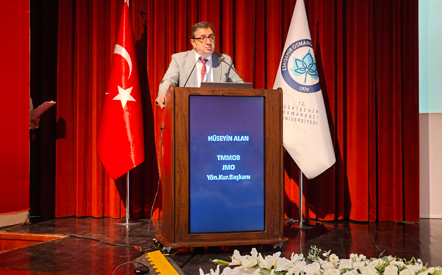 Yalçın’ın ardından TMMOB Jeoloji Mühendisleri Odası Yönetim Kurulu Başkanı Hüseyin Alan konuşmasını yaptı. Konuşmasına Odamız Genel Merkez ve Eskişehir Şubemizin öncülüğünde MTA Genel Müdürlüğü, AFAD Başkanlığı, Eskişehir Osmangazi Üniversitesi Jeoloji Mühendisliği Bölüm Başkanlığı, İLBANK Planlama ve Koordinasyon Dairesi Başkanlığı ile Türk Toraks Derneği’nin ortak organizasyonunda gerçekleştirilmekte olan ve birçok kurum ve kuruluş tarafından desteklenen, “Sağlıklı Kentler İçin Tıbbi Jeoloji” ana temalı  “3. Tıbbi Çalıştayı” dolayısı ile aranızda bulunmaktan büyük bir onur duyduğumu belirtmek isterim” sözleri ile başlayan Alan, Tıbbi Jeoloji’nin önemine dikkat çeken açıklamalar yaptı. Alan Çalıştaydaki sunumların ve tartışmaların ülkemizdeki tıbbi jeoloji sorunlarının kavranması ve bu sorunlara çözümler üretilmesi sürecinde hem mesleki hem de meslekler arasında ortak çalışma kültürü ve toplumsal duyarlılıklarımızın yükseltilmesine önemli katkılar sunacağı temennisi ile sözlerini noktaladı.