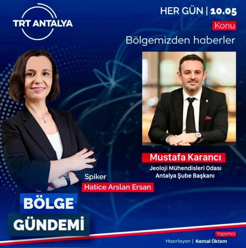 Şube Başkanımız Mustafa Karancı, 11 Aralık 2025 tarihinde TRT Antalya Radyosu`nun "Bölge Gündemi" programında Hatice Aslan Ersan`ın konuğu oldu. Bölge Jeolojisi, Antalya`nın Deprem Tehlikesi ve Güncel Sismik Hareketlilik üzerine değerlendirmelerde bulundu.
