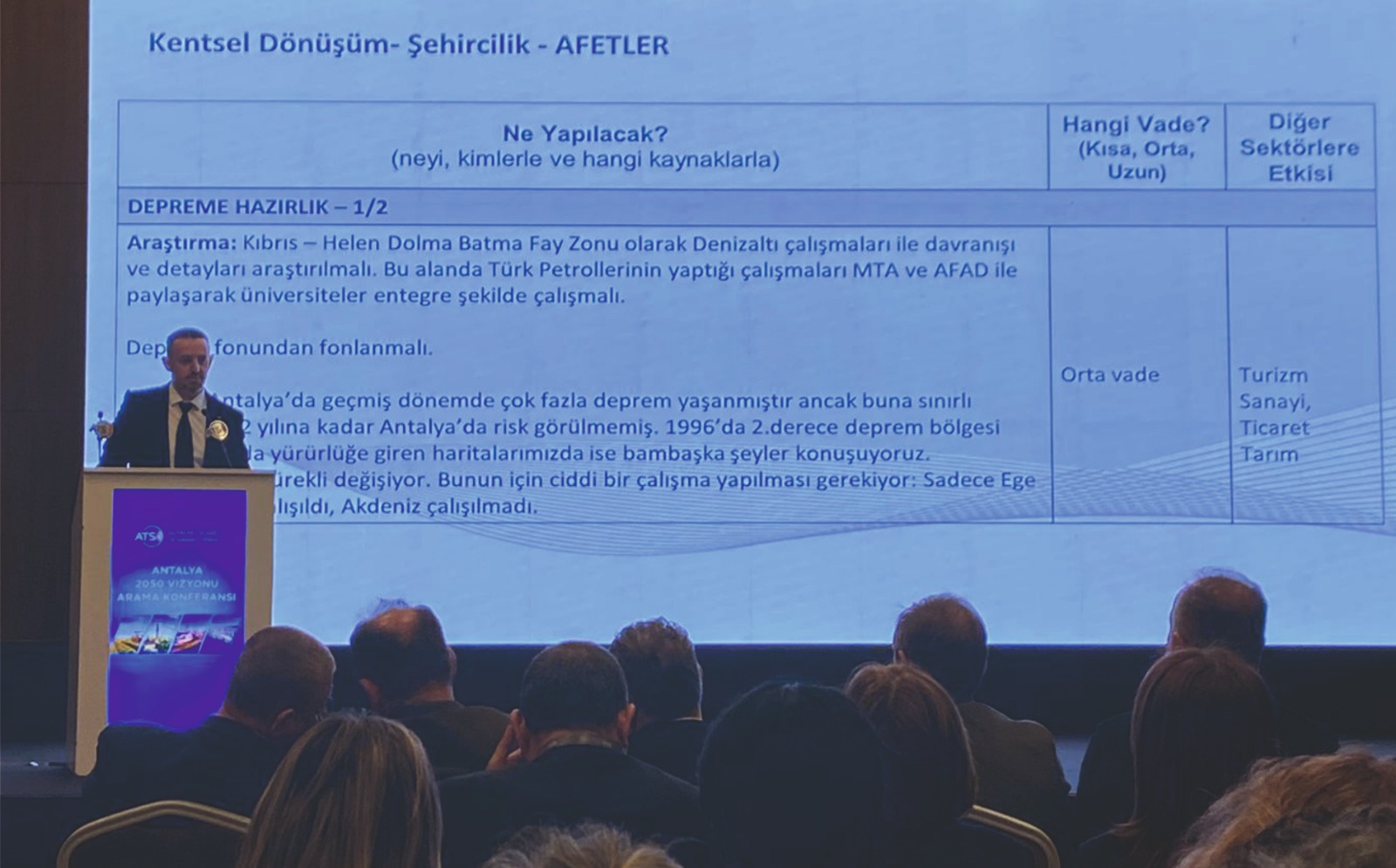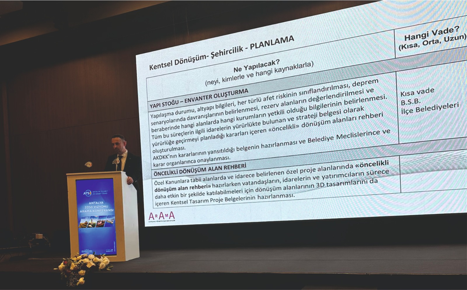 Antalya Ticaret ve Sanayi Odası tarafından 12-14 Aralık 2025 tarihinde düzenlenen Antalya 2050 Vizyonu Arama Konferansı’na Şube Başkanımız Mustafa Karancı ile katılım sağladık. Şube Başkanımız Mustafa Karancı tarafından "Kentsel Dönüşüm ve Şehircilik Grubu" olarak yürüttüğümüz çalışmanın sunumu gerçekleştirildi.