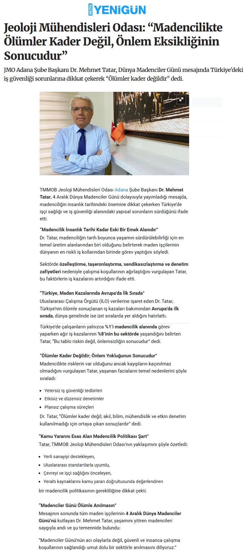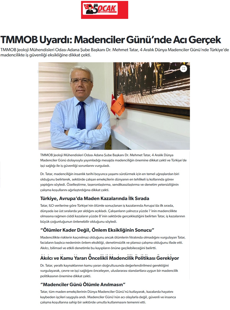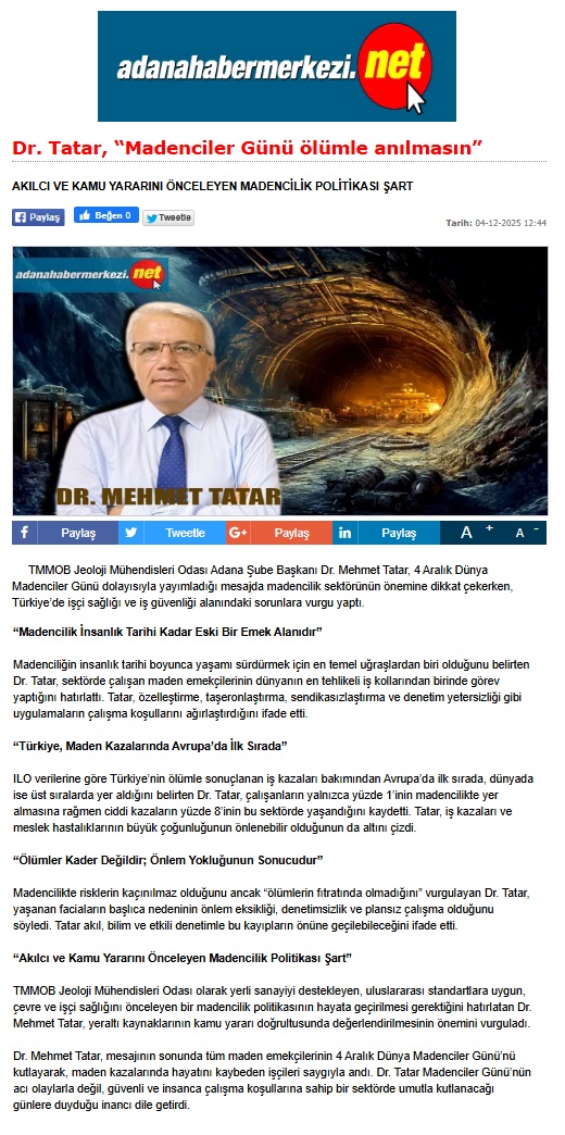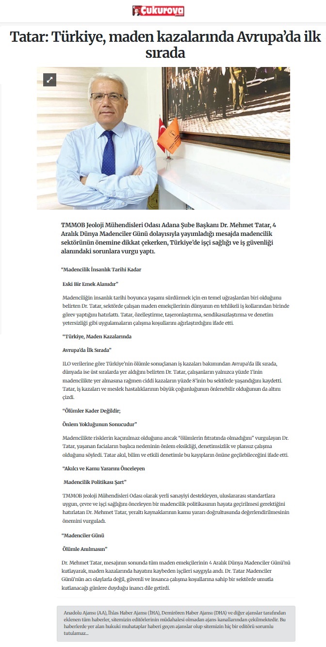 Açıklamada; Madenciliğin insanlık tarihi boyunca yaşamı sürdürmek için en temel uğraşlardan biri olduğunu belirten Dr. Tatar, sektörde çalışan maden emekçilerinin dünyanın en tehlikeli iş kollarından birinde görev yaptığını hatırlattı. Tatar, özelleştirme, taşeronlaştırma, sendikasızlaştırma ve denetim yetersizliği gibi uygulamaların çalışma koşullarını ağırlaştırdığını ifade etti.