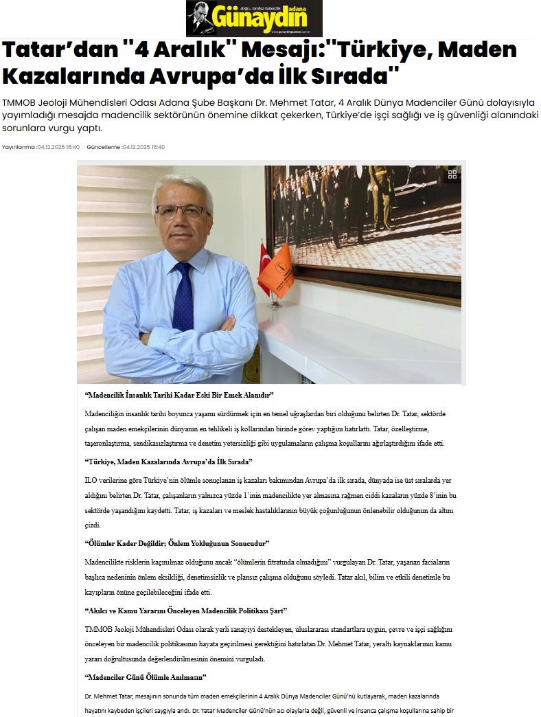 Tüm maden emekçilerinin 4 Aralık Dünya Madenciler Günü’nü kutlayarak, maden kazalarında hayatını kaybeden işçileri saygıyla andı. Dr. Tatar Madenciler Günü’nün acı olaylarla değil, güvenli ve insanca çalışma koşullarına sahip bir sektörde umutla kutlanacağı günlere duyduğu inancı dile getirdi.
