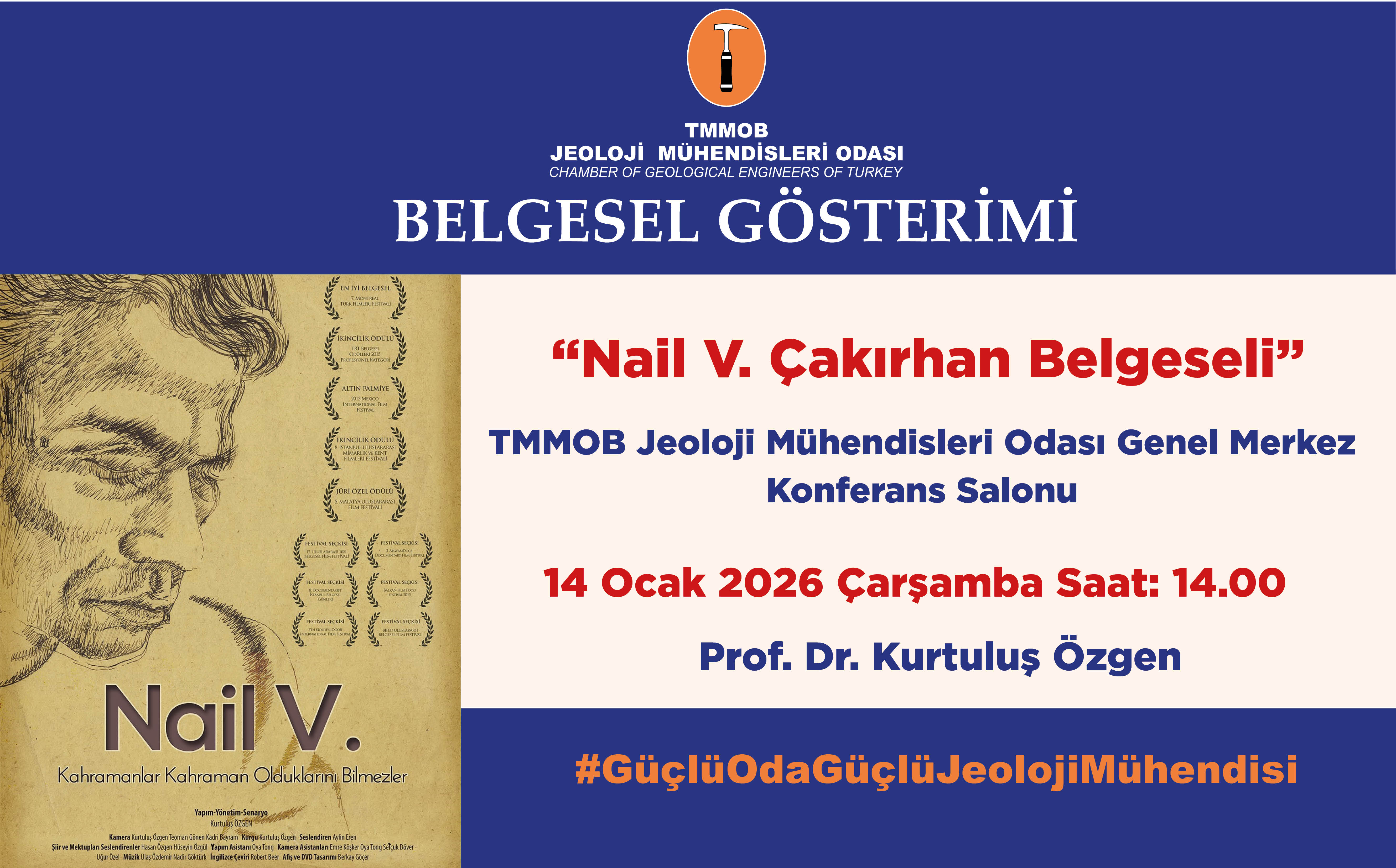 Odamızın Emekli Komisyonu tarafından 14 Ocak Çarşamba günü saat 14.00`de TMMOB Jeoloji Mühendisleri Odası Genel Merkez Binası’nın Konferans Salonu`nda Sayın Prof. Dr. Kurtuluş Özgen tarafından “Nail V. Çakırhan Belgeseli” gösterimi düzenlenecektir.