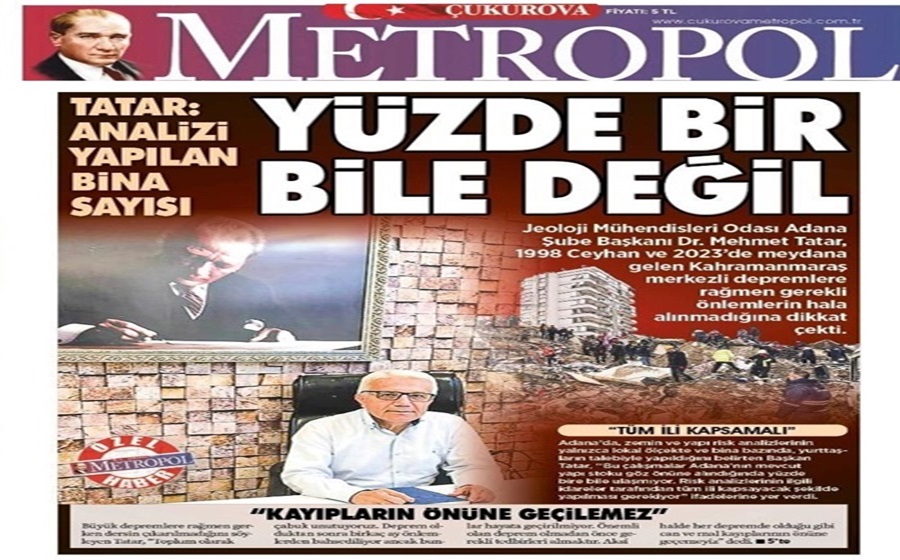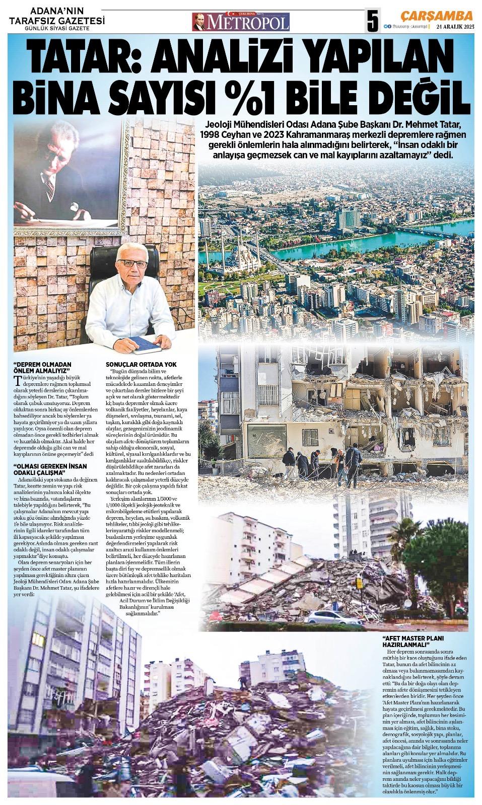 24.12.2025 tarihinde Şube Başkanımız Dr. Mehmet TATAR, Adana METROPOL Gazetesine "Deprem ve Afet"ler ile ilgili özel röportaj vermiştir.