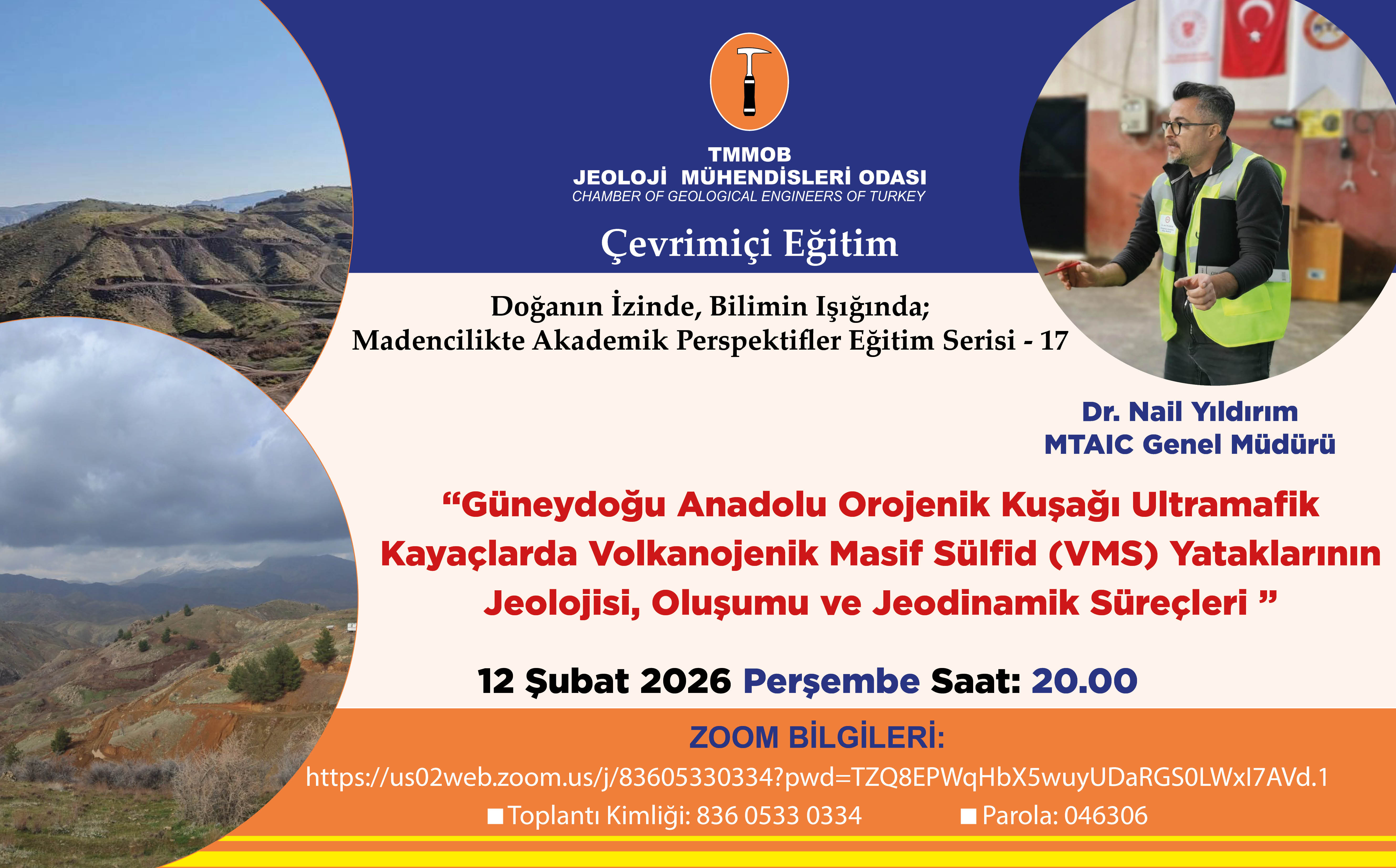 "Güneydoğu Anadolu Orojenik Kuşağı Ultramafik Kayaçlarda Volkanojenik Masif Sülfid (VMS) Yataklarının Jeolojisi, Oluşumu ve Jeodinamik Süreçleri " başlıklı çevrimiçi eğitim düzenlenecektir.