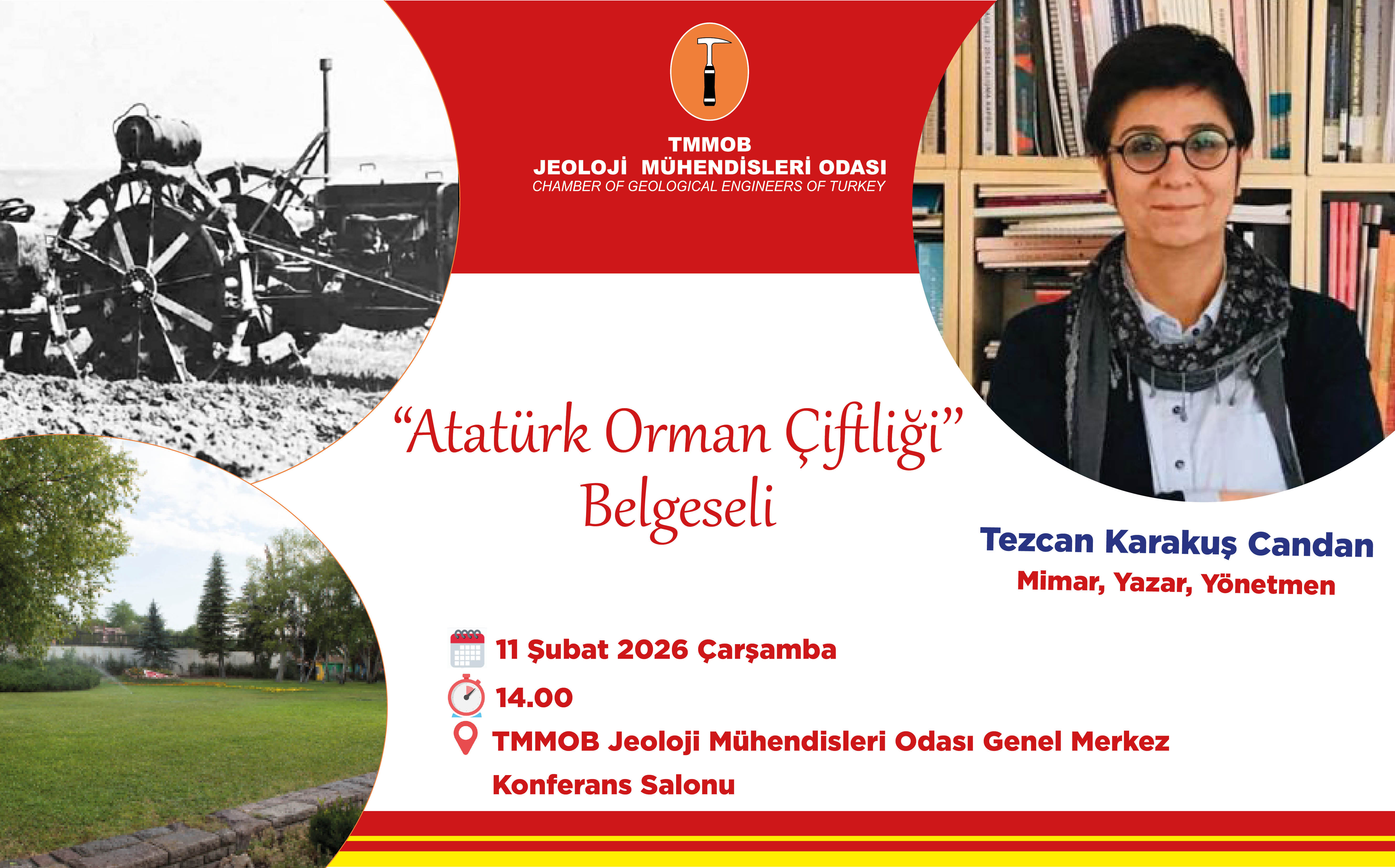 Atatürk Orman Çiftliği`nin 100. yılı kapsamında hazırlanan Çiğdem Toker, Canan Güllü, Nihal Kemaloğlu, Aksel Kemaloğlu, Redife Kolçak, Gökçe Bolat ile Tezcan Karakuş Candan`ın  seslendirdiği "Ben Atatürk Orman Çiftliği" başlıklı belgesel gösterimi saat 14.00`te TMMOB Jeoloji Mühendisleri Odası Genel Merkez Binası’nın Konferans Salonu`nda Mimar, Yazar, Yönetmen Tezcan Karakuş Candan tarafından gerçekleştirilecektir.