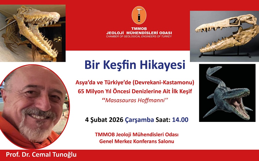 Odamızın Emekli Komisyonu tarafından 4 Şubat Çarşamba günü saat 14.00`de TMMOB Jeoloji Mühendisleri Odası Genel Merkez Binası’nın Konferans Salonu`nda Sayın Prof. Dr. Cemal Tunoğlu tarafından ``Bir Keşfin Hikayesi Asya`da ve Türkiye`de (Devrekani-Kastamonu) 65 Milyon Yıl Öncesi Denizlerine Ait İlk Keşif Masasauras Hoffmanni`` konu başlığı ile söyleşi düzenledi.