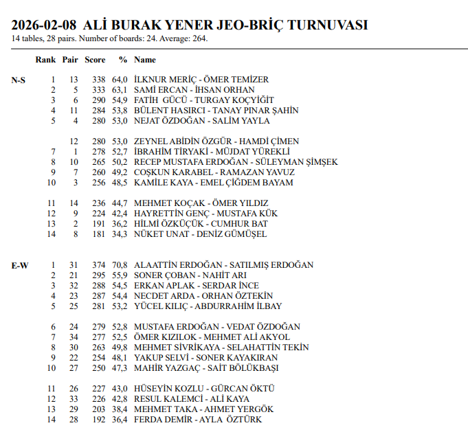 Dr. Ali Burak Yener adına düzenlenen bu turnuva; briç arkadaşlarının, dostlarının, buna vesile olan JMO‘nun O`na vedasıdır.