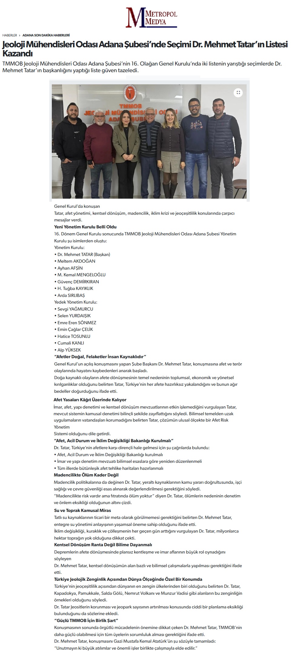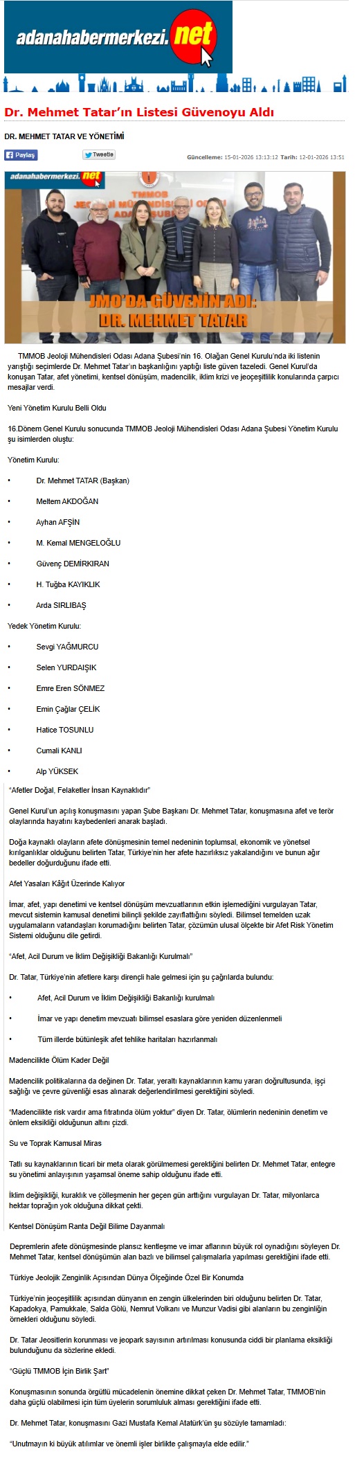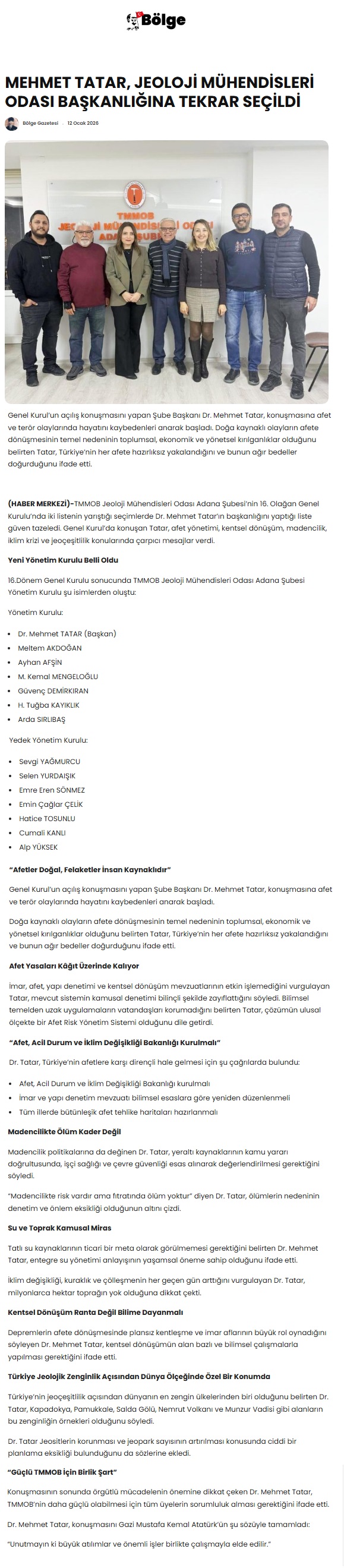 Şubemizin 16. Olağan Genel Kurulu Jeoloji Mühendisleri Odası Adana Şubesi Konferans Salonunda 10-11 Ocak 2026 tarihleri arasında yapıldı.