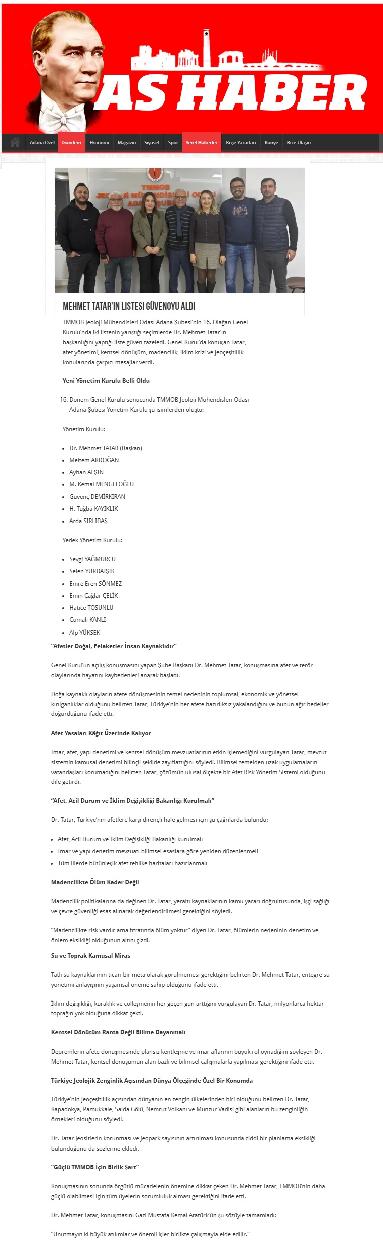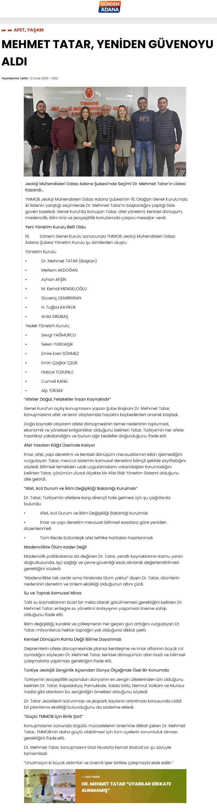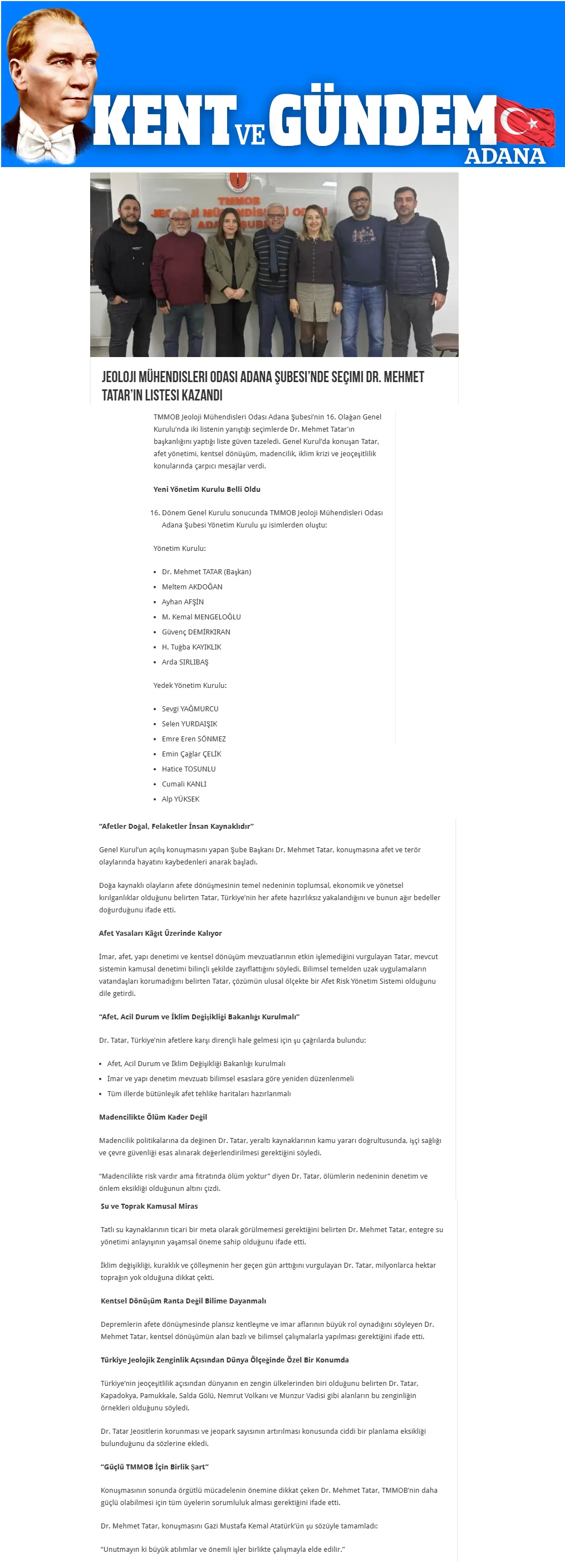 Yine Gündem gereği konuk konuşmacılar konuşmalarını yapmıştır. Sırasıyla Jeoloji Mühendisleri Odası Genel Merkez Başkanı Hüseyin ALAN, CHP Adana Milletvekili Müzeyyen ŞEVKİN, CHP Adana Milletvekili Ayhan BARUT, Jeofizik Mühendisleri Odası Adana Şube Başkanı Emin PİŞKİN, Şehir Plancıları Odası Adama Şube Başkanı İlker SÖĞÜT, İnşaat Mühendisleri Odası Adana Şube Başkanı Hıdır ÇAK, Gıda Mühendisleri Odası Adana Şube Başkanı Levent YERGÖK, Elektrik Mühendisleri Odası Adana Şube Başkanı Mehmet MAK, CHP Adana İl Başkan Yardımcısı İnşaat Mühendisi Volkan ERGİN, Maden Mühendisleri Odası Adana Şube Eski Başkanı Mehmet YILMAZ, TMMOB Adana İKK Sekreteri Kerem ŞAHİN konuşarak görüşlerini belirttiler ve oluşacak 16. Dönem Yönetim Kurulu`na başarılar dilediler.