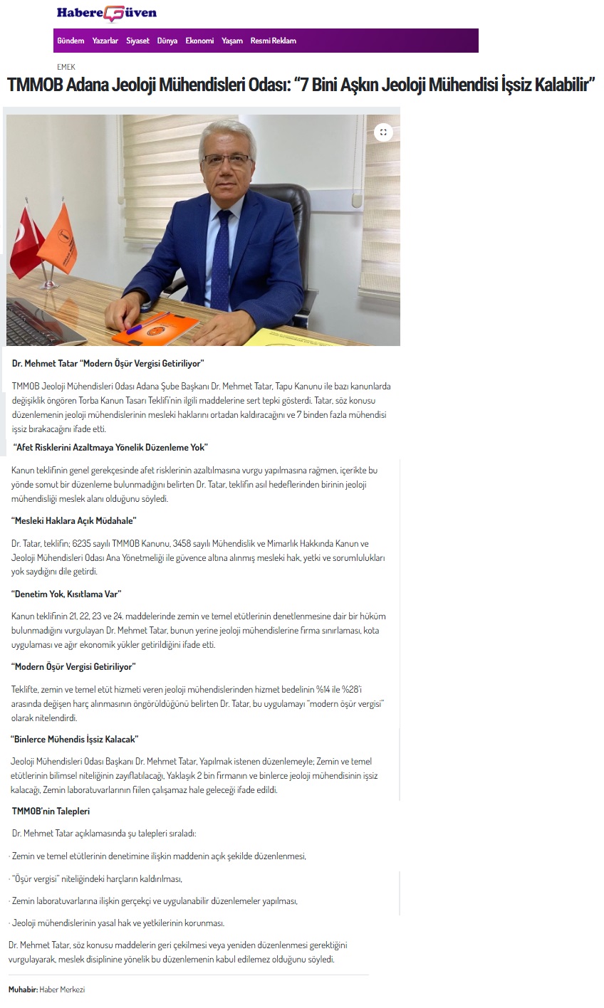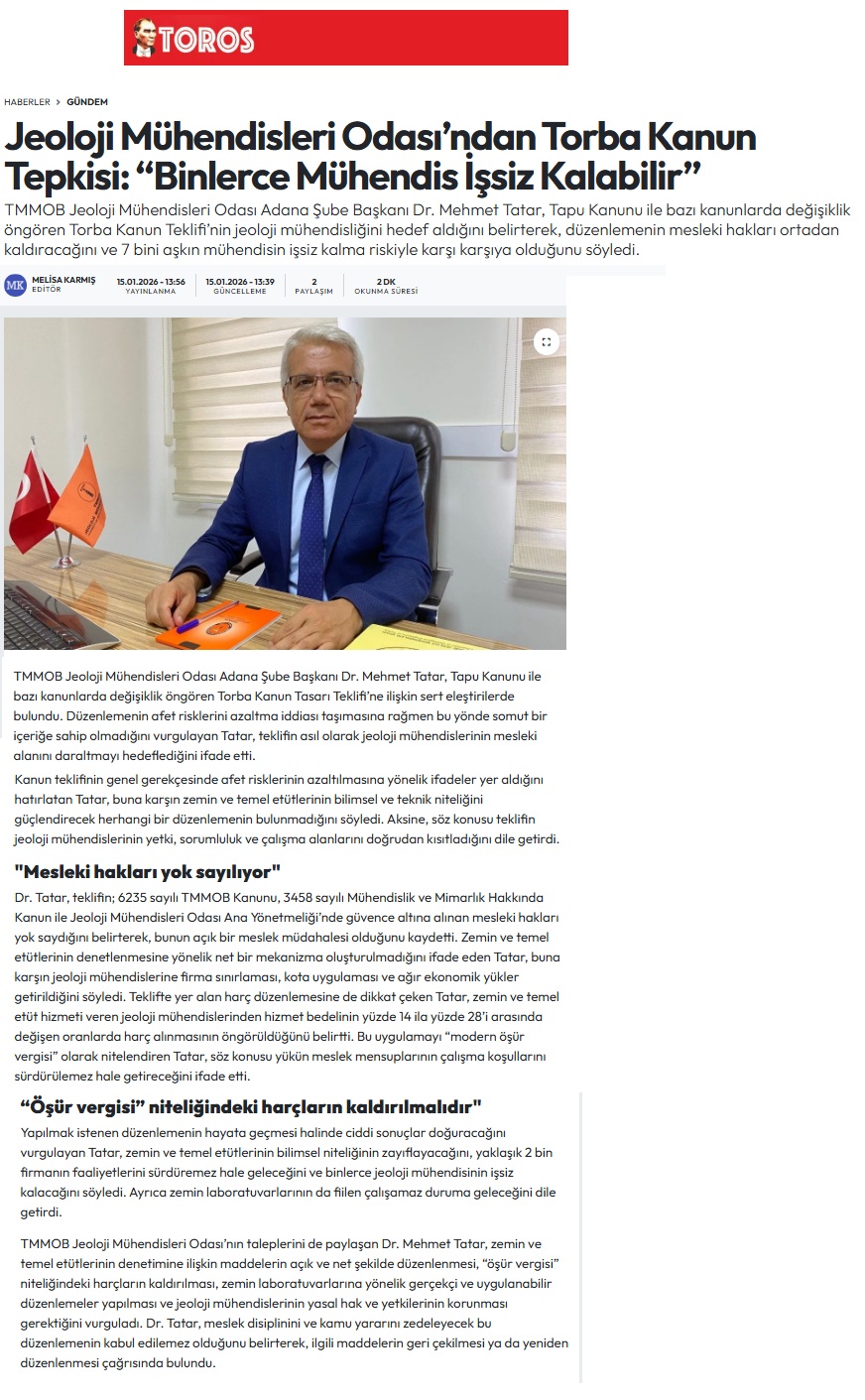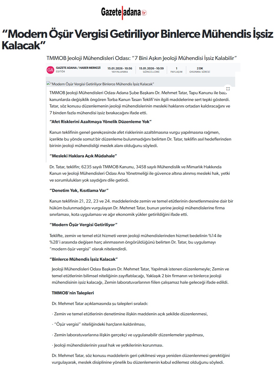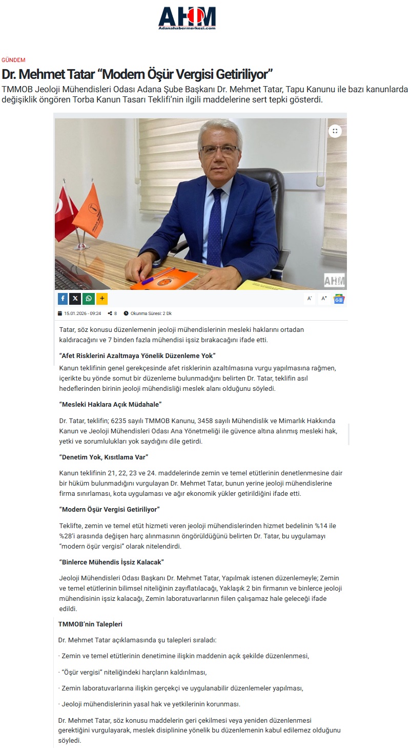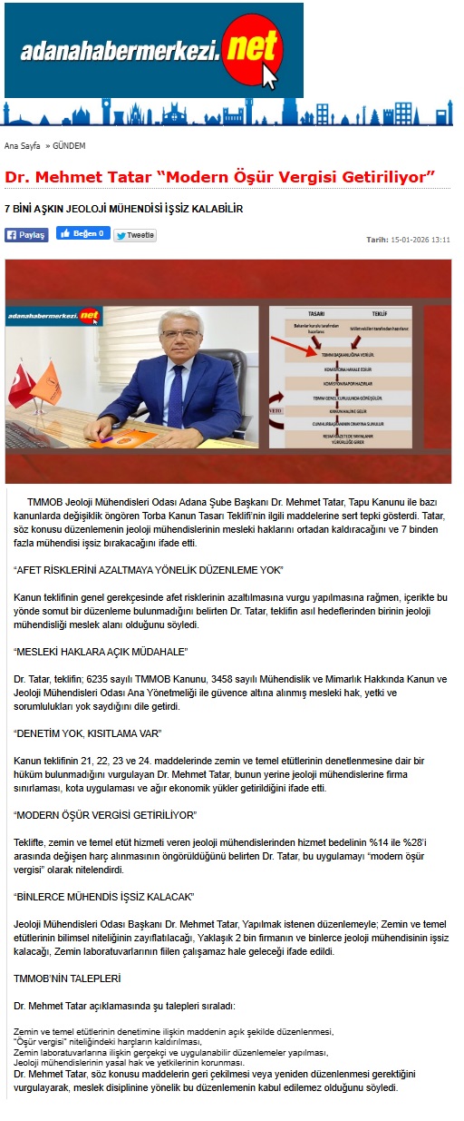 15.01.2026 tarihinde Şube Başkanımız Dr. Mehmet TATAR, tapu kanunu ve bazı kanunlarda değişiklik öngören kanun tasarısı teklifinin mesleğimizi ilgilendiren 21, 22, 23 ve 24. maddeleri ile ilgili olarak basın açıklaması yapmıştır.