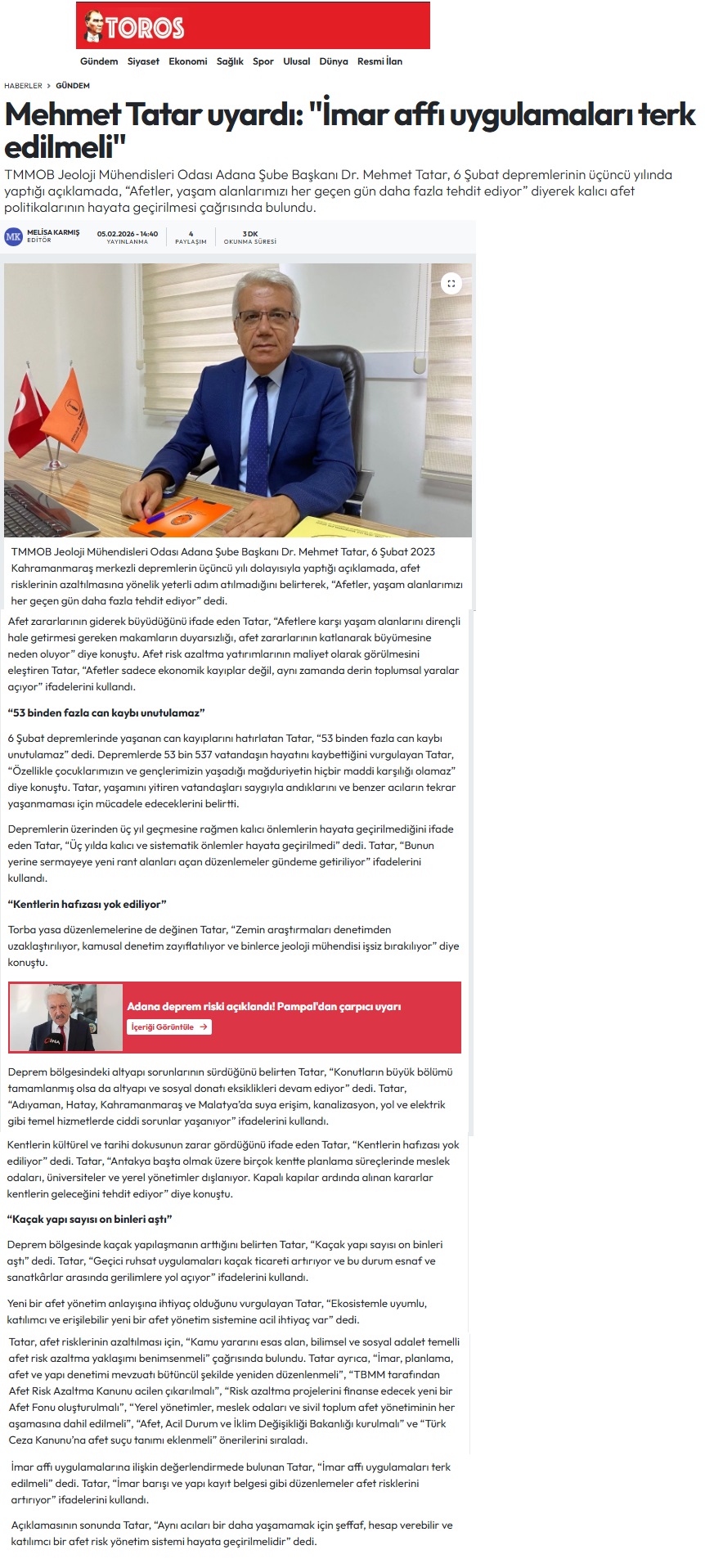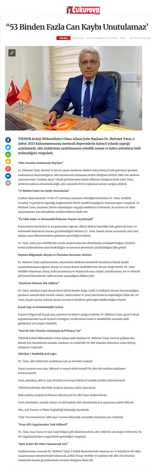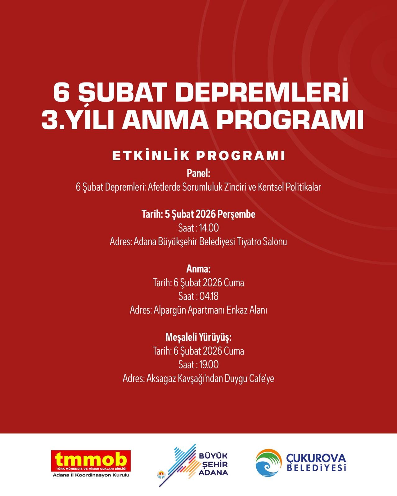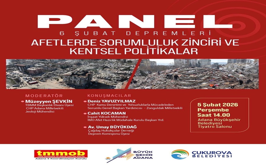 05.02.2026 tarihinde TMMOB Adana İKK Bileşenleri, Adana Büyükşehir Belediyesi ve Çukurova Belediyesi 6 Şubat 2023 depremleri 3 yılı anma günü nedeni ile ortaklaşa panel düzenlenmiştir.