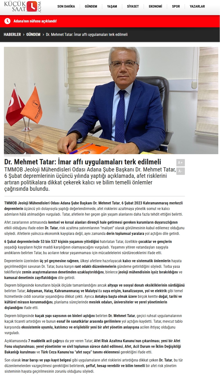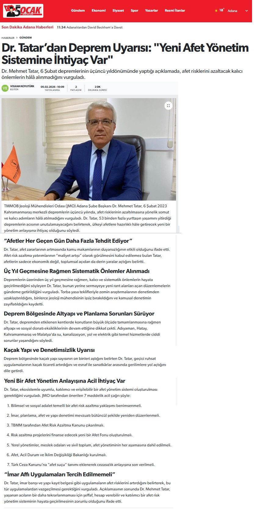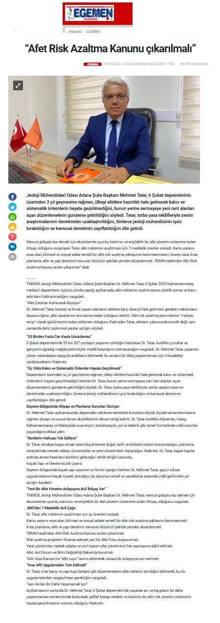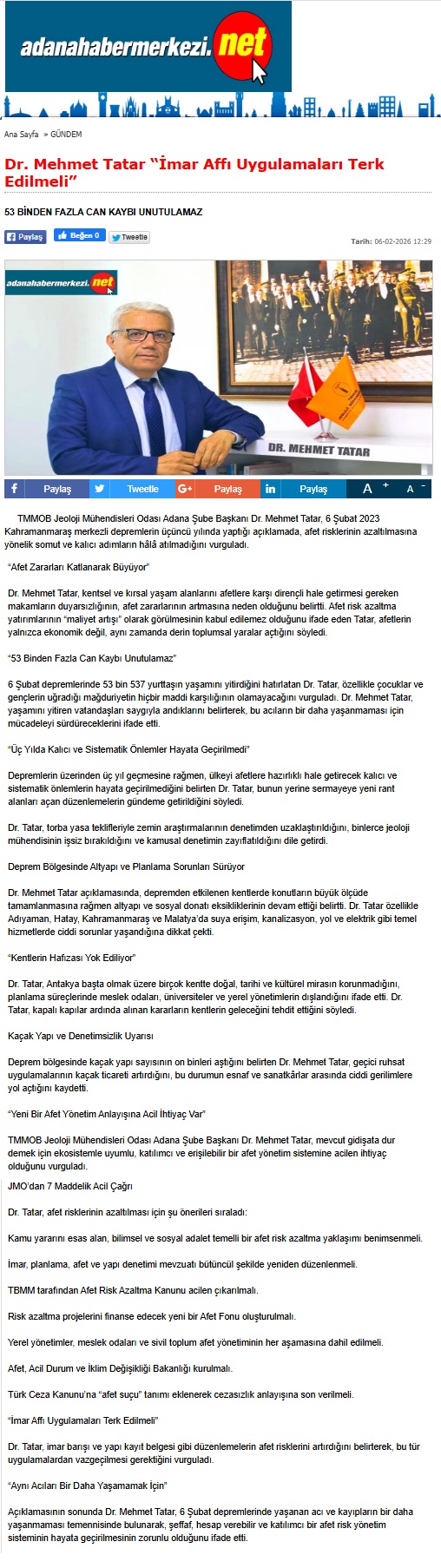 05.02.2026 tarihinde TMMOB Adana İKK Bileşenleri, Adana Büyükşehir Belediyesi ve Çukurova Belediyesi 6 Şubat 2023 depremleri 3 yılı anma günü nedeni ile ortaklaşa panel düzenlenmiştir.