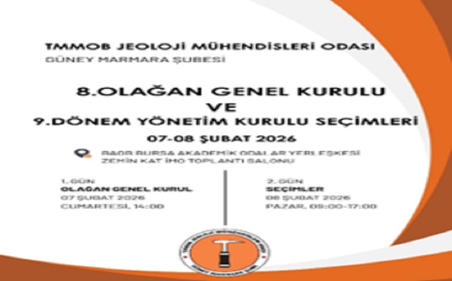 JMO Güney Marmara Şubesi 8. Olağan Genel Kurulu 7 Şubat 2026 saat: 14:00 , 9. Çalışma Dönemi Seçimi 8 Şubat 2026 9:00-17:00 saatleri arasında BAOB yerleşkesi İMO Toplantı Salonu’nda (Zemin Kat) olacaktır. Bilimle, emekle, inatla, umutla.