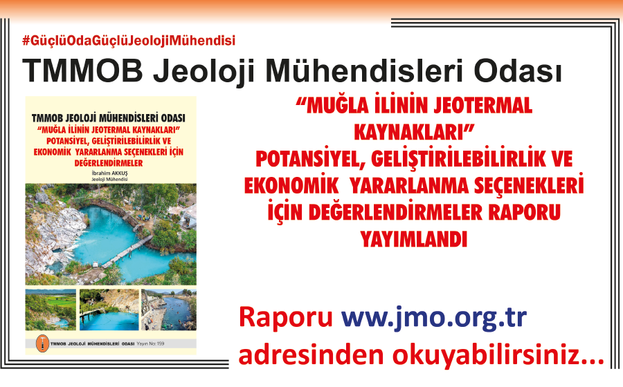 Ülkemizin enerjide dış kaynaklara olan bağımlılığının azaltılması, yerli, yenilenebilir ve temiz enerji kaynaklarına yöneliminin desteklenmesi, halk sağlığının korunması ve toplumsal refahın arttırılması konusunda çaba gösteren Odamız, “30. Dönem Çalışma Programı” kapsamında aldığı karar çerçevesinde, “Jeotermal Kaynaklar ve Doğal Mineralli Sular Komisyonumuz” öncülüğünde illerimizin jeotermal kaynaklar ve doğal mineralli sular potansiyelinin belirlenmesi, kamuoyu ve karar vericilerle paylaşılması projesi çerçevesinde Jeoloji Mühendisi İbrahim Akkuş tarafından hazırlanan “Muğla İlinin Jeotermal Kaynakları Potansiyel, Geliştirilebilirlik ve Ekonomik Yararlanma Seçenekleri İçin Değerlendirmeler” raporu yayımlandı.