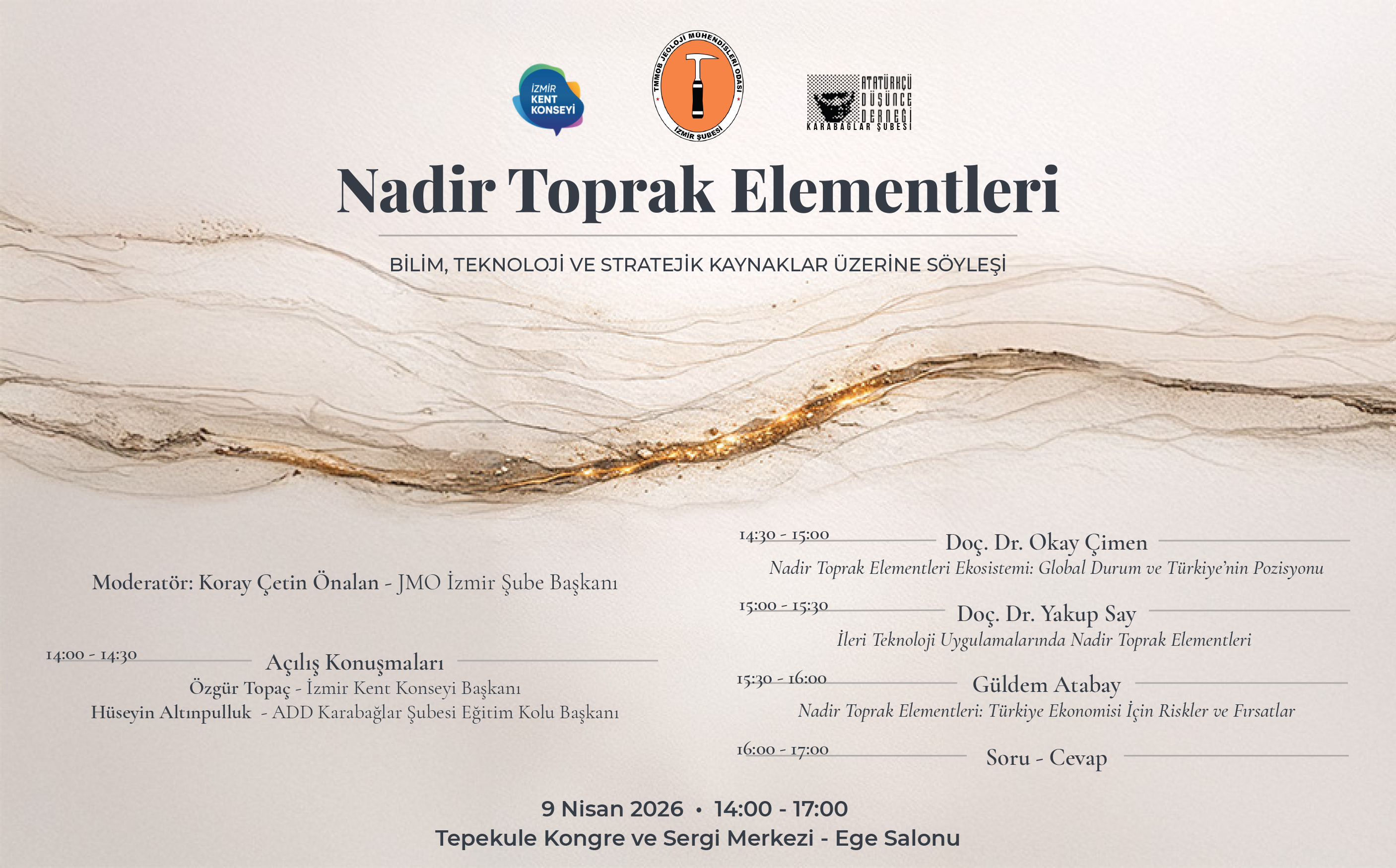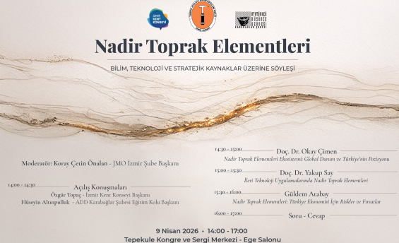 TMMOB Jeoloji Mühendisleri Odası İzmir Şubesi, İzmir Kent Konseyi ve ADD Karabağlar Şubesi iş birliğiyle düzenlenen "Nadir Toprak Elementleri: Bilim, Teknoloji ve Stratejik Kaynaklar Üzerine Söyleşi" 9 Nisan 2026 tarihinde gerçekleşecek.