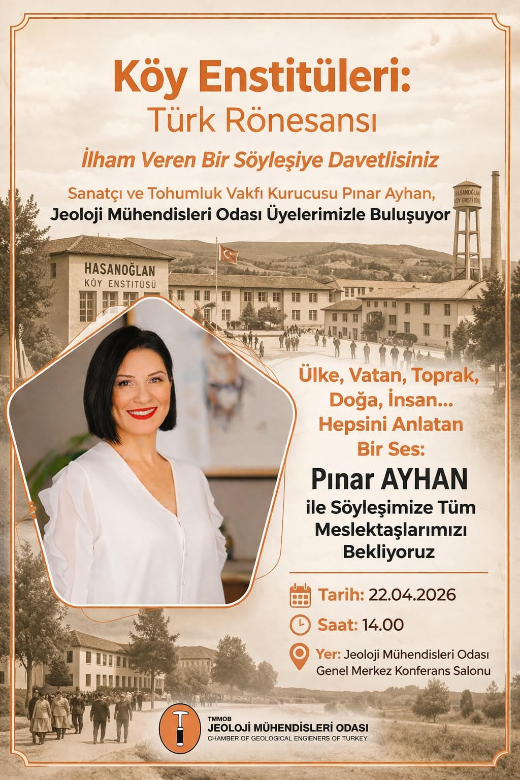 Odamızın Emekli Komisyonu tarafından 22 Nisan 2026 Çarşamba günü saat 14.00`te TMMOB Jeoloji Mühendisleri Odası Genel Merkez Konferans Salonu`nda Sanatçı ve Tohumluk Vakfı Kurucusu Sayın Pınar Ayhan tarafından “Köy Enstitüleri:Türk Rönesansı” konu başlığı ile söyleşi düzenlenecektir.