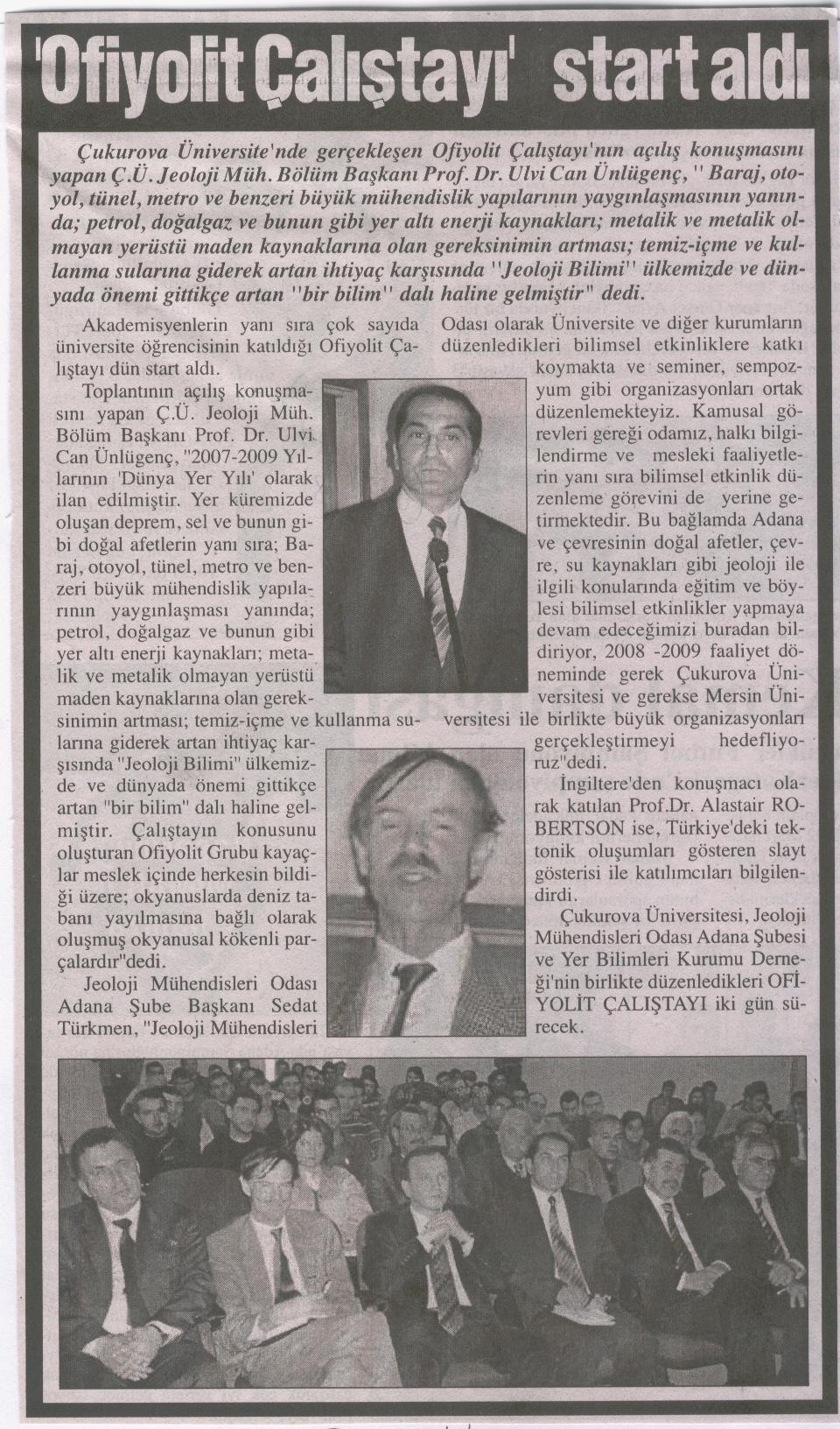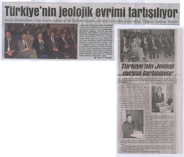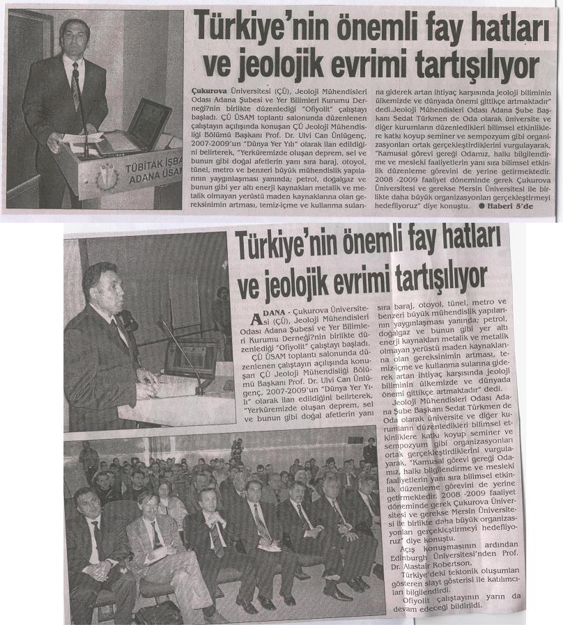 Çukurova Üniversitesi Jeoloji Mühendisliği Bölümü, Yerbilimleri Kurumu Derneği ve Jeoloji Mühendisleri Odası Adana Şubesinin Birlikte düzenledikleri Ofiyolit Çalıştayı 8 -11 Mart 2008 Tarihleri arasınad Çukurova Üniversitesi Balcalı Kampüsünde yapılmıştır. Çalıştayda ofiyolit konusunda çalışmalar yapmış çok sayıda Akademisyenin sunduğu bildirilerin yanında, Anadolu‘nun Paleozoyik ve Mesozoyik evrimi (Tetis ve Neo Tetis  evrimi) konusunda  Prof. Dr. Alastair ROBERTSON,  Metemorfizma evreleri konusunda Prof. Dr. Aral OKAY, değerli sunumlar yapmıştır.